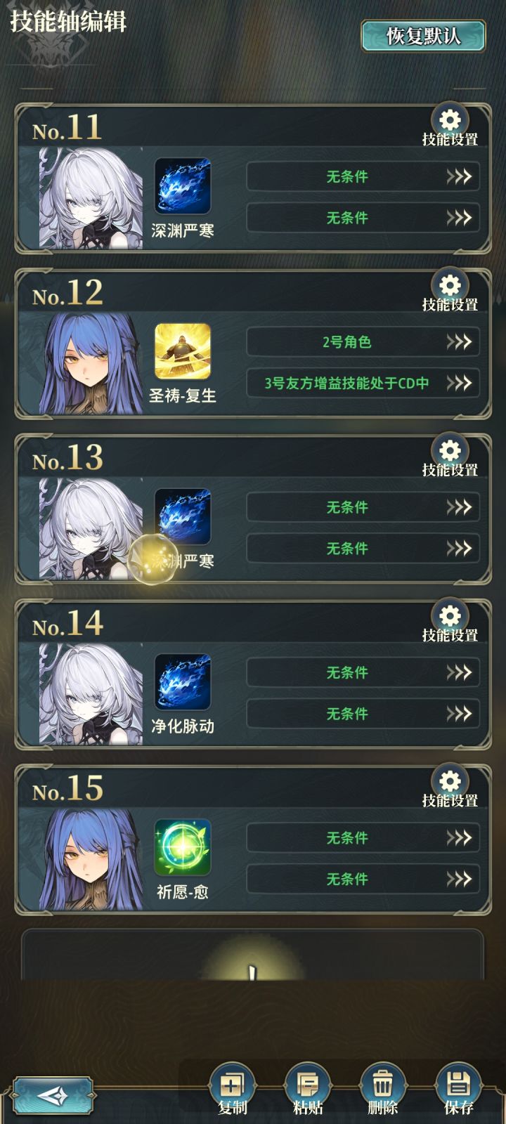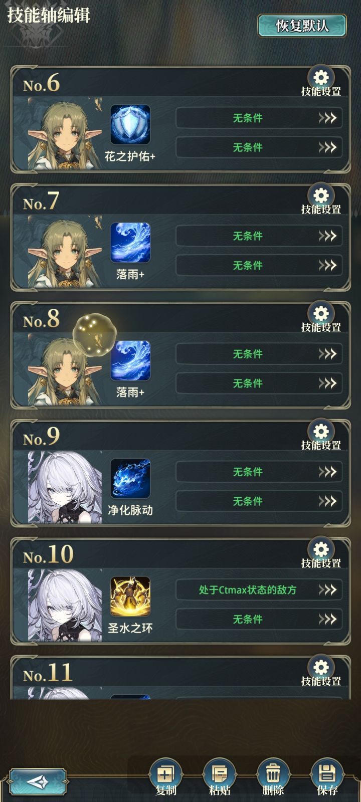 本图制作于天人版本春节前适用于刷取 始源魔兽——噩梦,以获取135附魔武器❶如果挂机的时候车速过快导致奥义放不出来,所有的队伍都只设置1个技能,就是法师主角的4技能——列阵组合咏唱。达成1T1键,基本上都能达标。可视伤害情况在法师4技能后设置——主召魔物技能,达成1+1,释放速度比传统2键快一点点。❷后排的老王角色如果没有,可以使用对应属性的机神代替阵容灵活多变,非最优解,可根据自