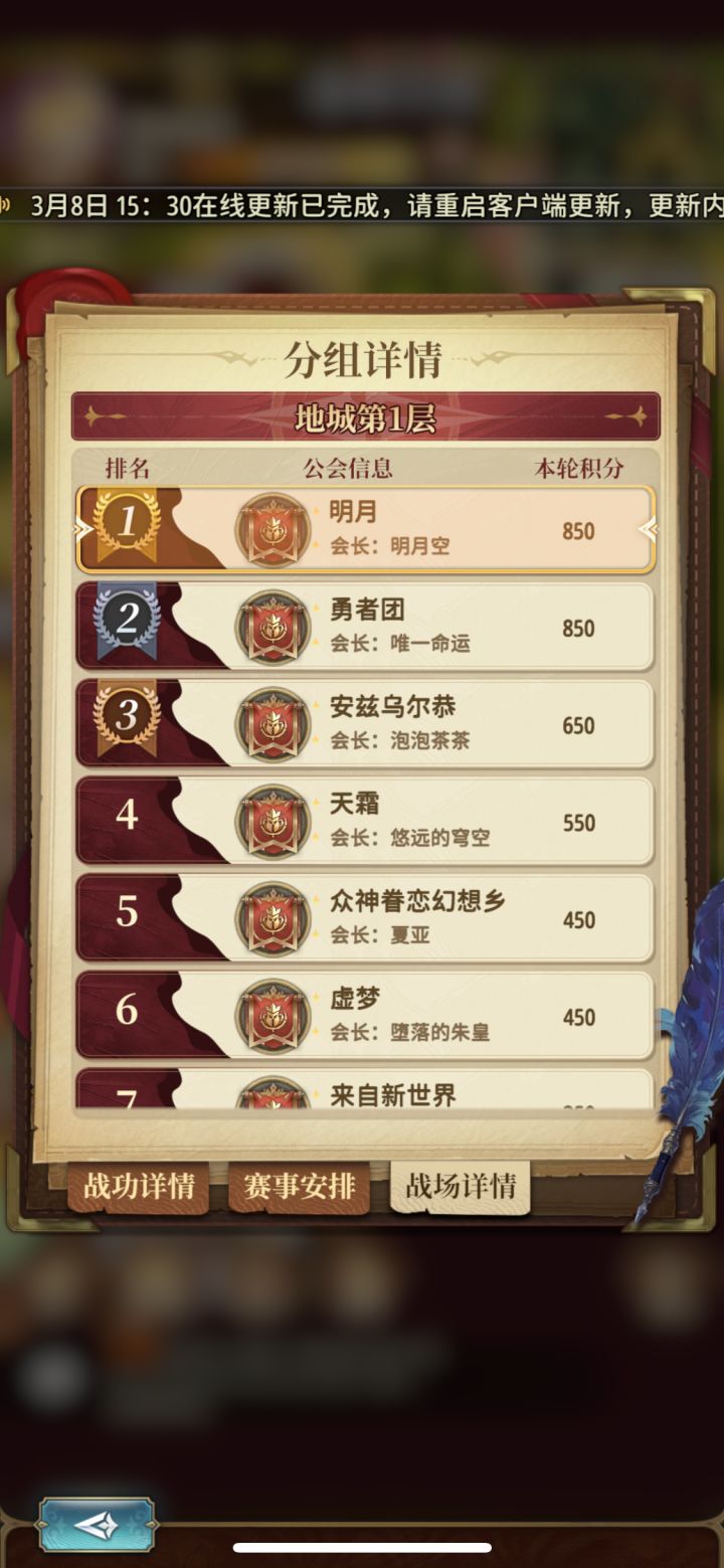 更新方式:在线更新更新内容:1、修复公会争霸活动中死亡后补充体力无法行军的问题2、优化公会争霸体力回复:每1分钟回复960 → 每5分钟回复960(体力上限为20000时)