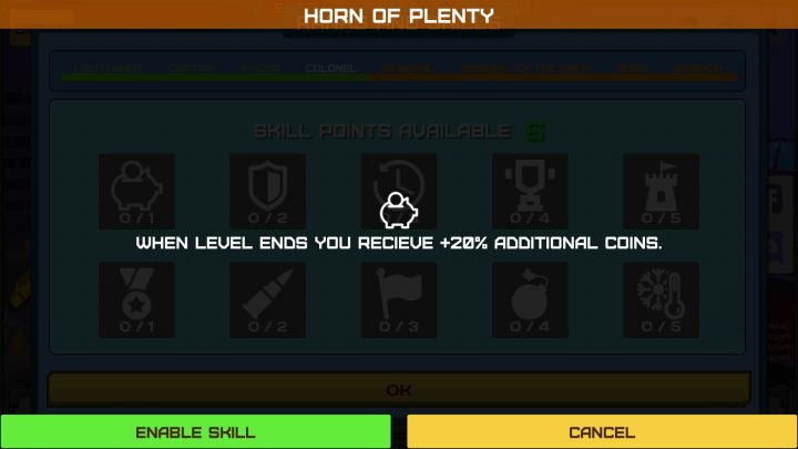 游戏里升一级获得一技能点,游戏结算和杀敌或者离线模式地图里捡经验币都能获得经验。游戏结束后增加20%结算金币。(通用技能,存钱必点)需要技能点1点激活。游戏结束后增加20%经验。(通用技能,冲级必点)需要技能点1点激活。增加队友20%装甲。(只限离线模式AI队友)需要技能点2点激活。增加队友20%伤害。(只限离线模式AI队友)需要技能点2点激活。队友复活时间减少20%。(只限离线模式AI