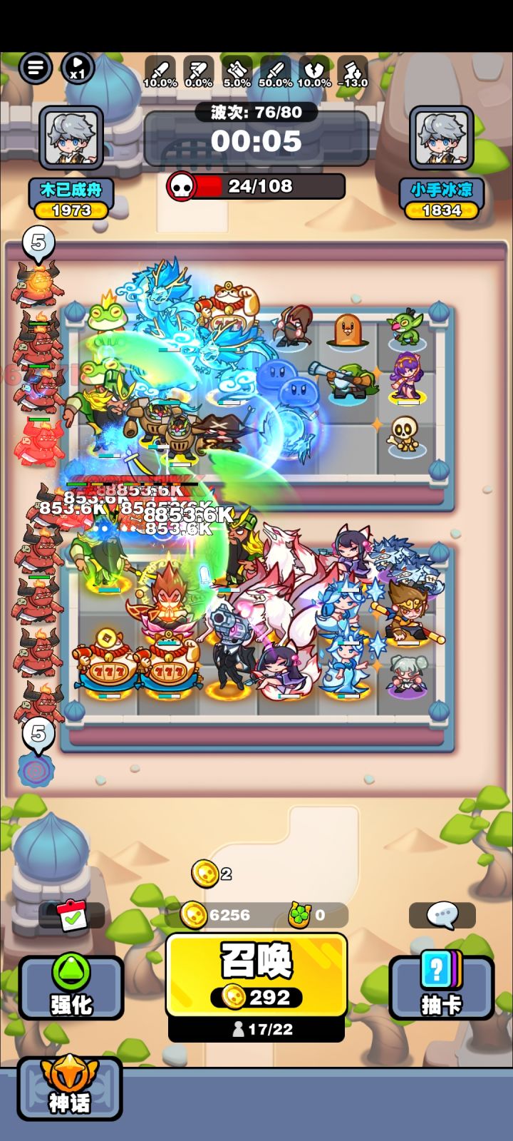20关以后-4就比较难打了,要么孵出5条及以上龙,要么成功变身2个青蛙,当然控制也是必须的,我用的狐狸,一般做2个,有舞女的时候冰女必做(剑仙也可以,不过我没有)不然小怪清不完。 20以后开局必须赌金,不然过不去(紫星不清楚),经济允许的话把金箱子都开了够10个币再抽金,一个是概率大一点,再一个有个满10币送2币的任务,出金之后全部币强化(除开熊猫其他金都能挺到第10波),攒到1800金币,召唤