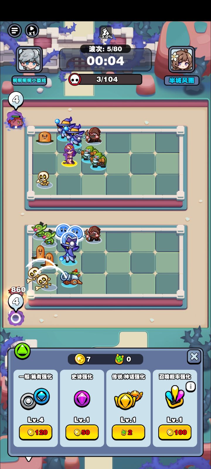20关以后-4就比较难打了,要么孵出5条及以上龙,要么成功变身2个青蛙,当然控制也是必须的,我用的狐狸,一般做2个,有舞女的时候冰女必做(剑仙也可以,不过我没有)不然小怪清不完。 20以后开局必须赌金,不然过不去(紫星不清楚),经济允许的话把金箱子都开了够10个币再抽金,一个是概率大一点,再一个有个满10币送2币的任务,出金之后全部币强化(除开熊猫其他金都能挺到第10波),攒到1800金币,召唤