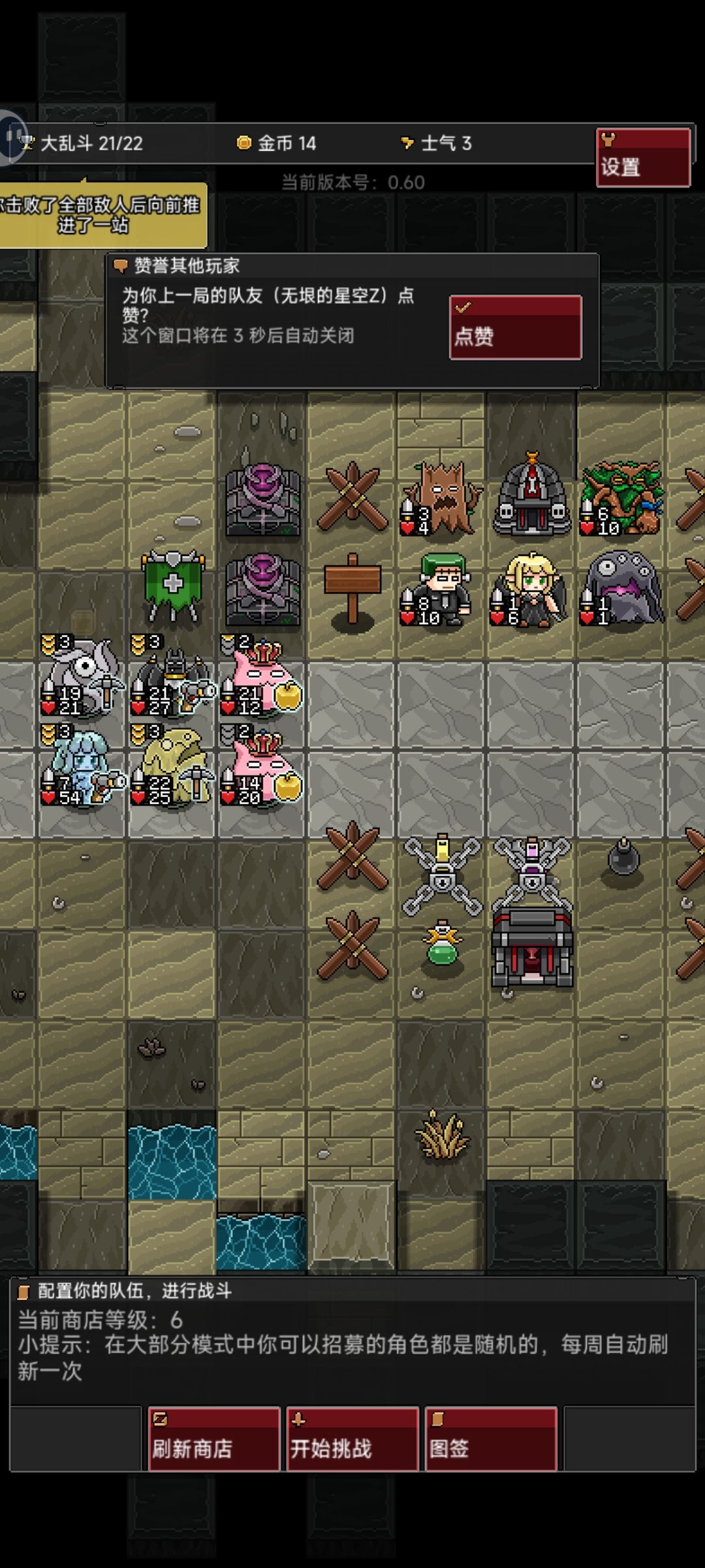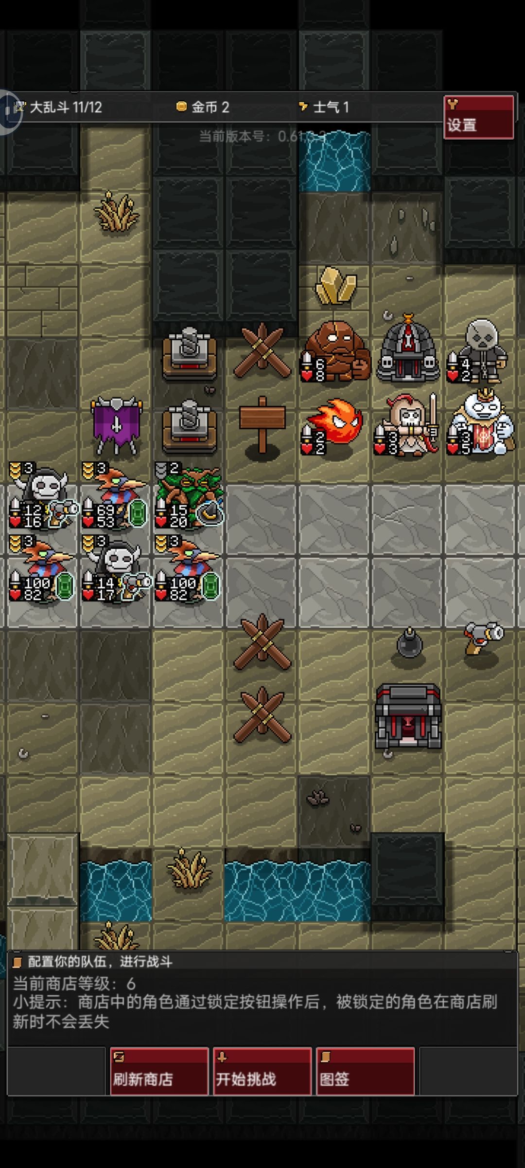 开局拿蜘蛛过渡,建筑可以选择魔王那个,更容易获胜或平局,自动升到3级时如果还有4血可以再卖2血升到4级,此时魔王已经没用了可以换其他的建筑,然后升到6级找大树,史莱姆,邪眼,鸡哥,和铁傀儡,优先邪眼和鸡哥和大树,铁傀儡1星就行,这把很非,打到结束才只拿了2个史莱姆,中途遇到扣2血加5攻的可以给铁傀儡吃,有点怕恶魔博士,但也不是那么怕