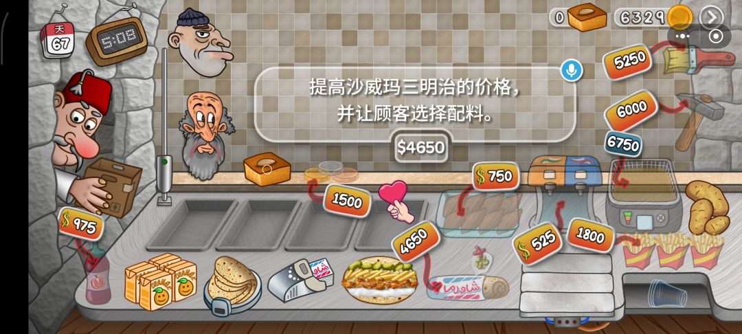 石榴糖浆:975-2775 配料步骤:350(点两次)-3150(点一次) 土豆:200-2400 橙汁:200 地瓜:750 刀:525(双刀)-3600(自动切割) 薯条:1800-4050-6000 培训员工:2100 炸薯条机:1500-6750 自动包装机:1200-3600 自动扔饼:975 选配料:4650-6750 饮料机:525-2100-5250 杯子:1200-3150 烤盘