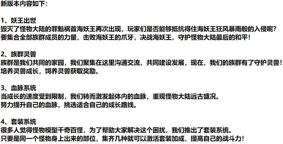 各位怪物工程师: 大家好啊!新的资料片《妖王出世》8月20日就要和大家见面啦!谢谢公测以来大家的支持,谢谢大家的等待!接下来就为大家介绍一下,开发组小伙伴加班加点4个月的工作成果! 妖王出世 这次资料片的重点内容,就是这个以族群为单位的挑战妖王活动啦,最多可以20人一起参加,场面非常壮观! 每天花费15分钟,和族群的小伙伴们一起去挑战妖王,就可以获得挑战奖励,击败每个妖王还有额外的大奖。除此以