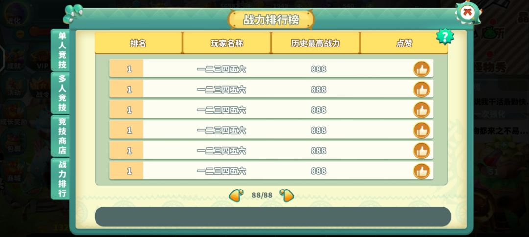 您战力最高达到过888。请再接再厉,继续加油! 重新启航礼包:Cgwcxqh 游戏交流群:798411503 乐辰官方福利群:723584302 官方微信公众号:乐辰游戏(送专属部件)