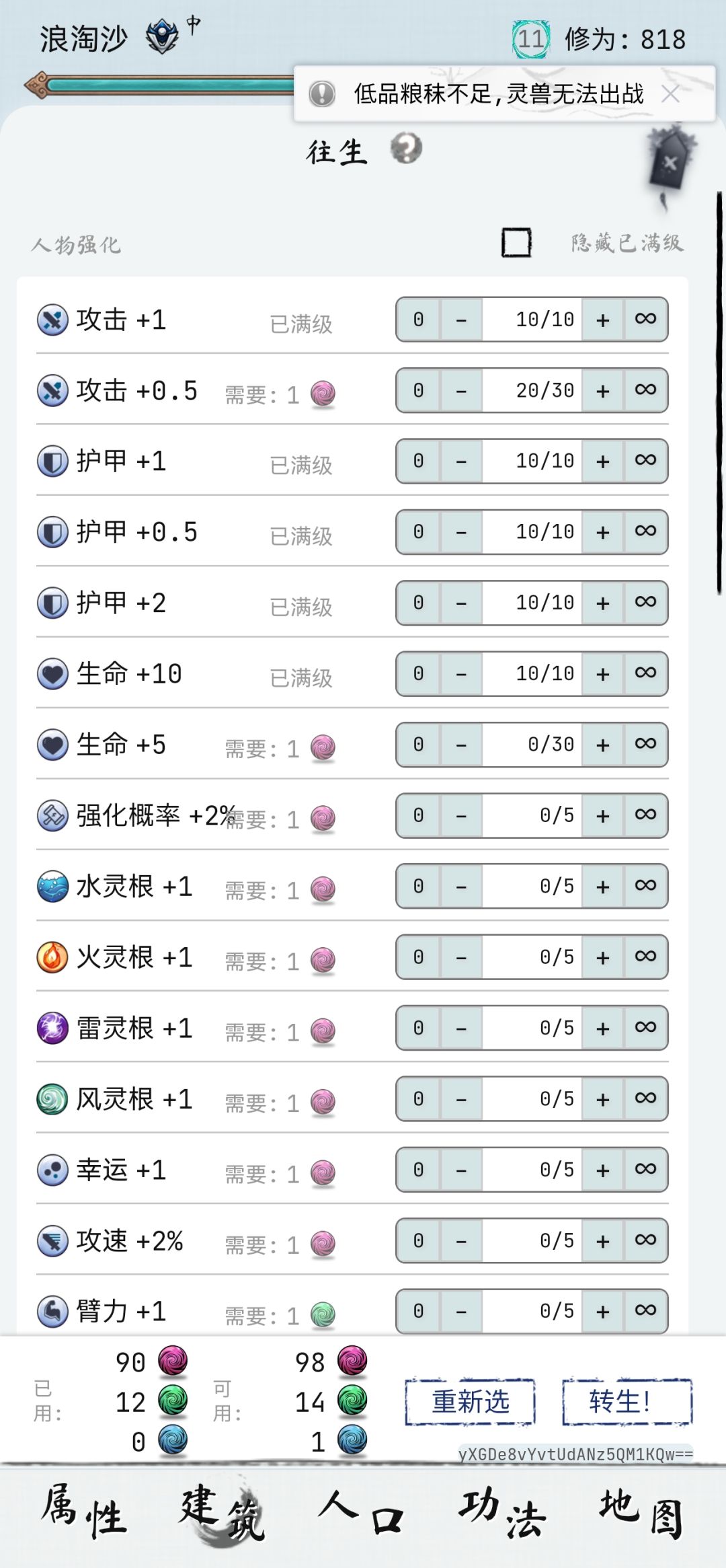 #大荒几许攻略 先说结论:我的建议是还是别玩灵根 折合下来每一点转生点可以点出5血或者1灵根。 一灵根用灵根甲可以折合成3血。 灵根剑给的战力提升没有护甲剑来的多,10灵根给的伤害more只有18,两件装备20灵根只有30左右,对于刷2-9而言提升反而没有普普通通臂力流高,属性点满护甲血量攻击以后,高周目直接安安心心用臂力套刷就完了。丢人灵根流只有一个甲是前期超模的,别的全亏模。 你就算已经全
