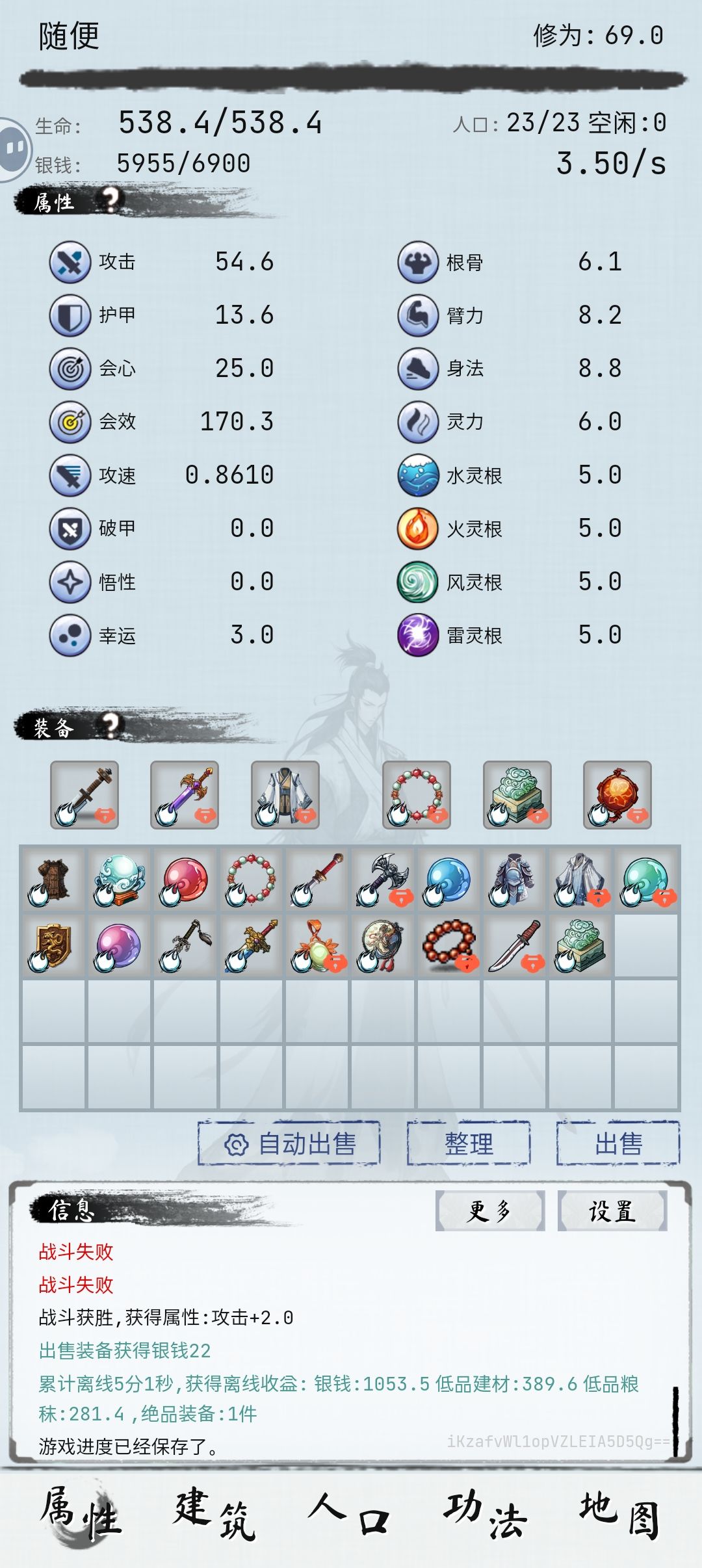 本帖为抛转引玉,你有别的思路以你为准 以下攻略大致需要50转,且至少有一个风点,不够的达不到这种效率,建议刷2-9。 不用解锁任何建筑和装备,至少点满一个灵根,建议火灵根。 最终标准装备: 5级中八阶青萍剑+5级中八阶紫霄+空明袍+灵风+明象+流景,往生咒吞10灵根对应的属性珠和噬魂刀,修为大概在220,耗时大概60-80分钟,当然,运气好运气差影响很大。 标准属性: 120+攻击,1050左
