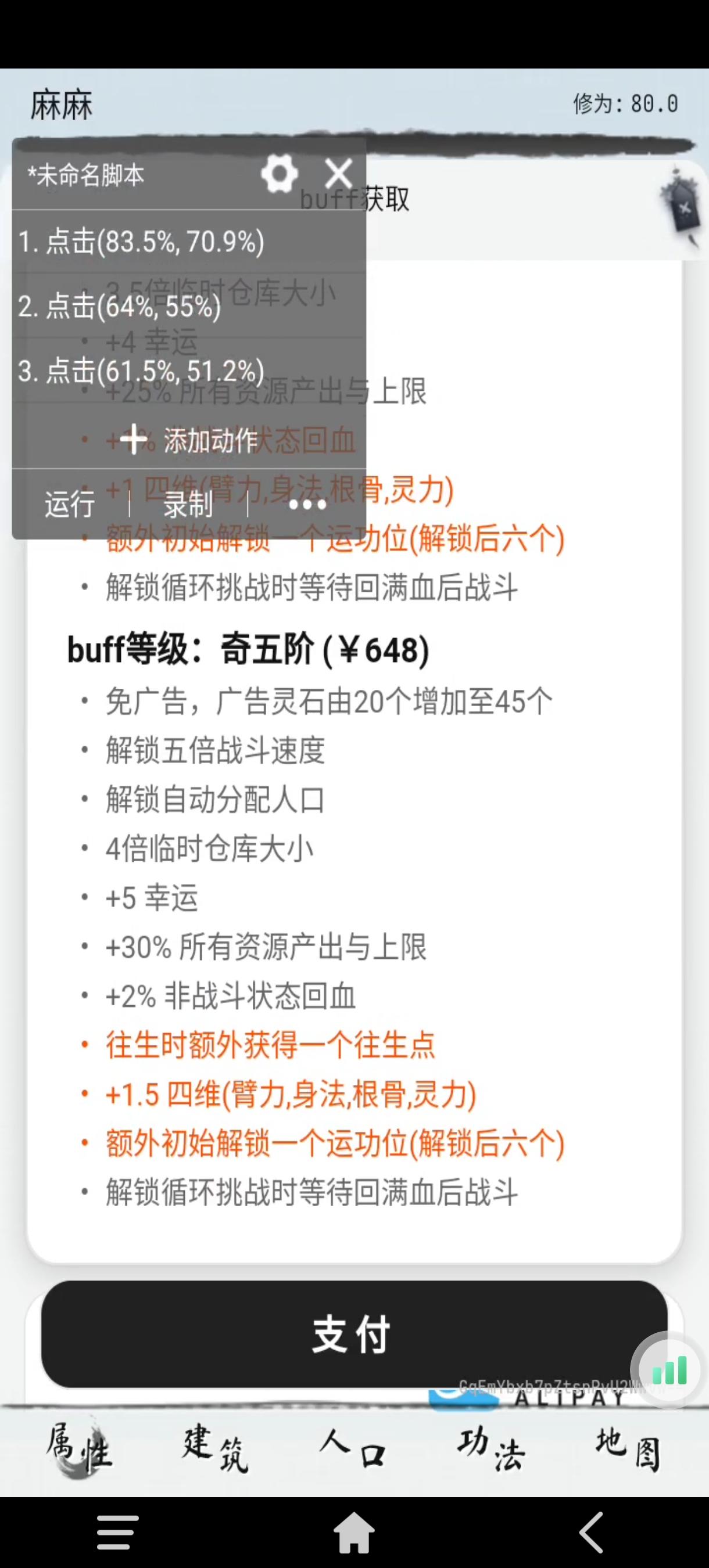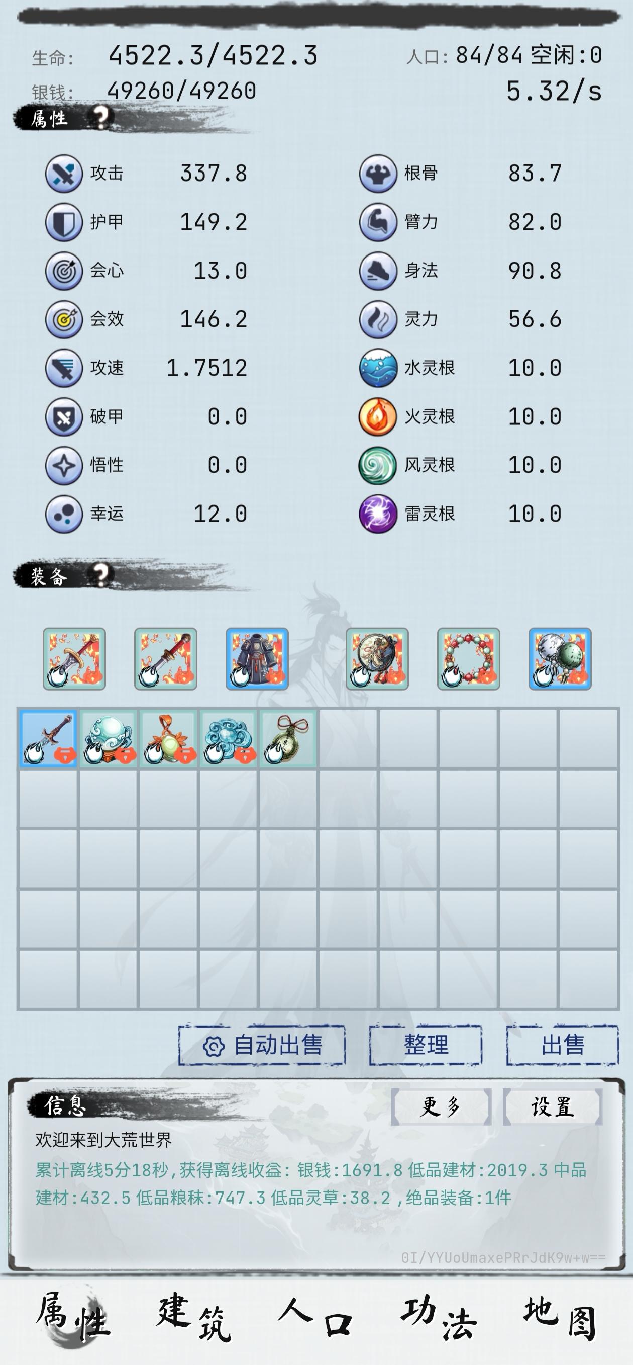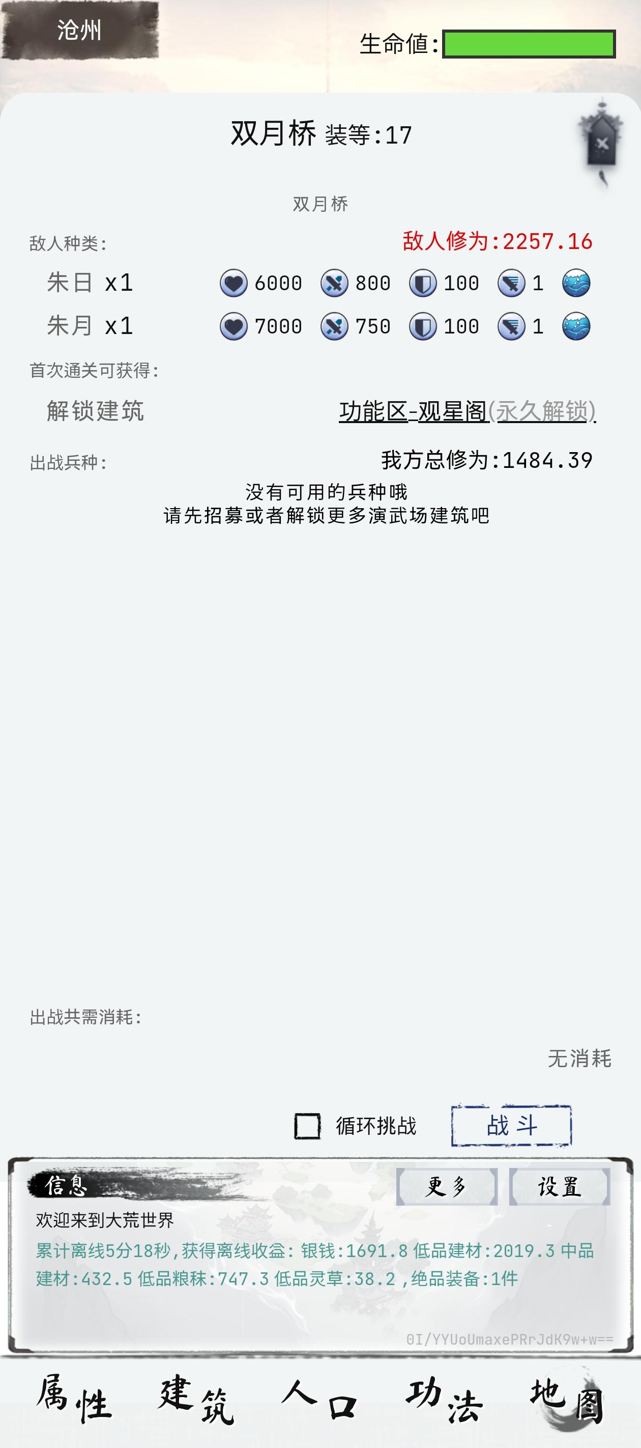 祭天选择的是攻击与回复 副武器带着暴击回血 攻击速度2.2,往生吞每次攻击增加4.5暴击与每次攻击附加2%毒伤,叠的非常快,刀刀暴击且3000血量情况下每秒攻击2次回血量高达100+,想想看,你强化15血量加多少修为,这战斗力回复的血量能提高多少看不到的修为 因为没有vip资源被限制,只能带11中和1民兵1弓 其他建筑强化目前能满的都满了 转生里的属性,15绿点,三围只+5,基础属性基本上都满,没