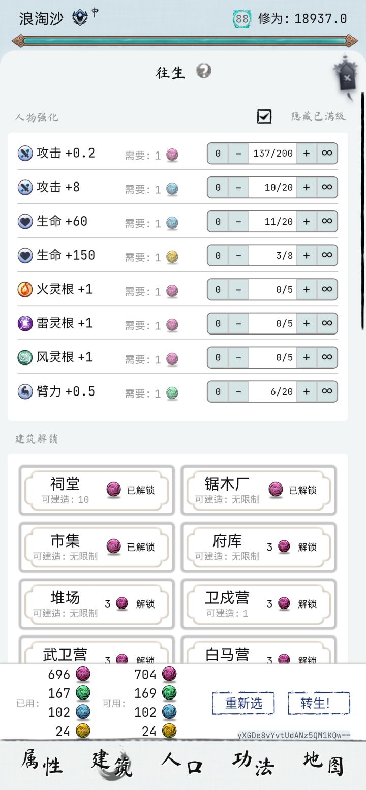 祭天选择的是攻击与回复 副武器带着暴击回血 攻击速度2.2,往生吞每次攻击增加4.5暴击与每次攻击附加2%毒伤,叠的非常快,刀刀暴击且3000血量情况下每秒攻击2次回血量高达100+,想想看,你强化15血量加多少修为,这战斗力回复的血量能提高多少看不到的修为 因为没有vip资源被限制,只能带11中和1民兵1弓 其他建筑强化目前能满的都满了 转生里的属性,15绿点,三围只+5,基础属性基本上都满,没