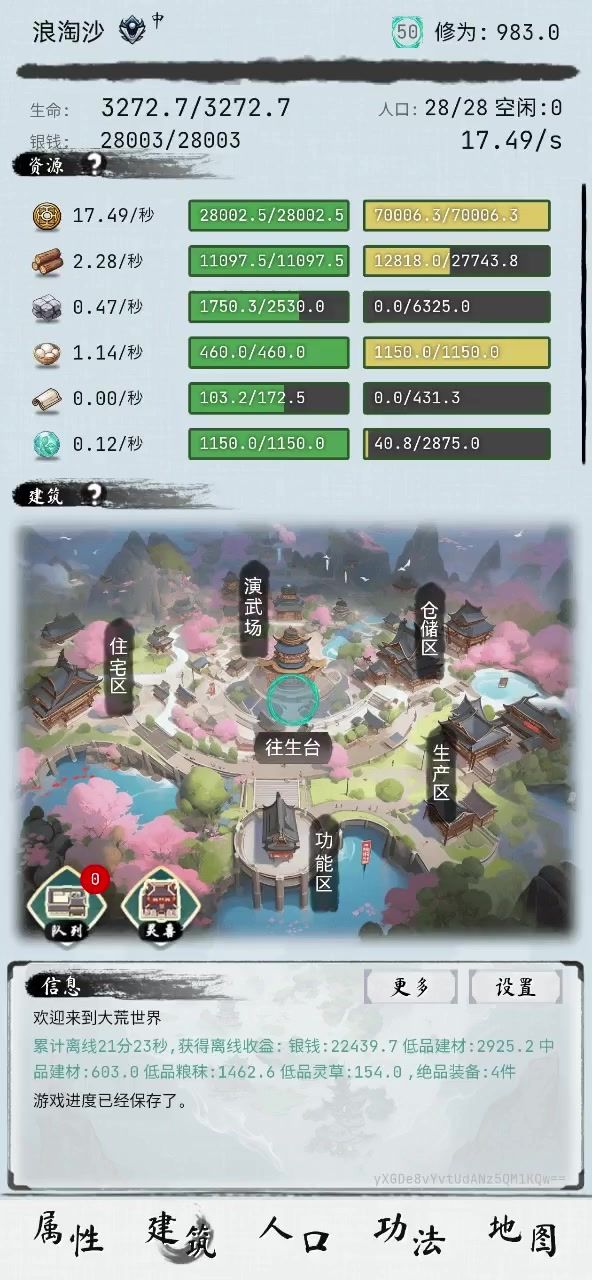 祭天选择的是攻击与回复 副武器带着暴击回血 攻击速度2.2,往生吞每次攻击增加4.5暴击与每次攻击附加2%毒伤,叠的非常快,刀刀暴击且3000血量情况下每秒攻击2次回血量高达100+,想想看,你强化15血量加多少修为,这战斗力回复的血量能提高多少看不到的修为 因为没有vip资源被限制,只能带11中和1民兵1弓 其他建筑强化目前能满的都满了 转生里的属性,15绿点,三围只+5,基础属性基本上都满,没