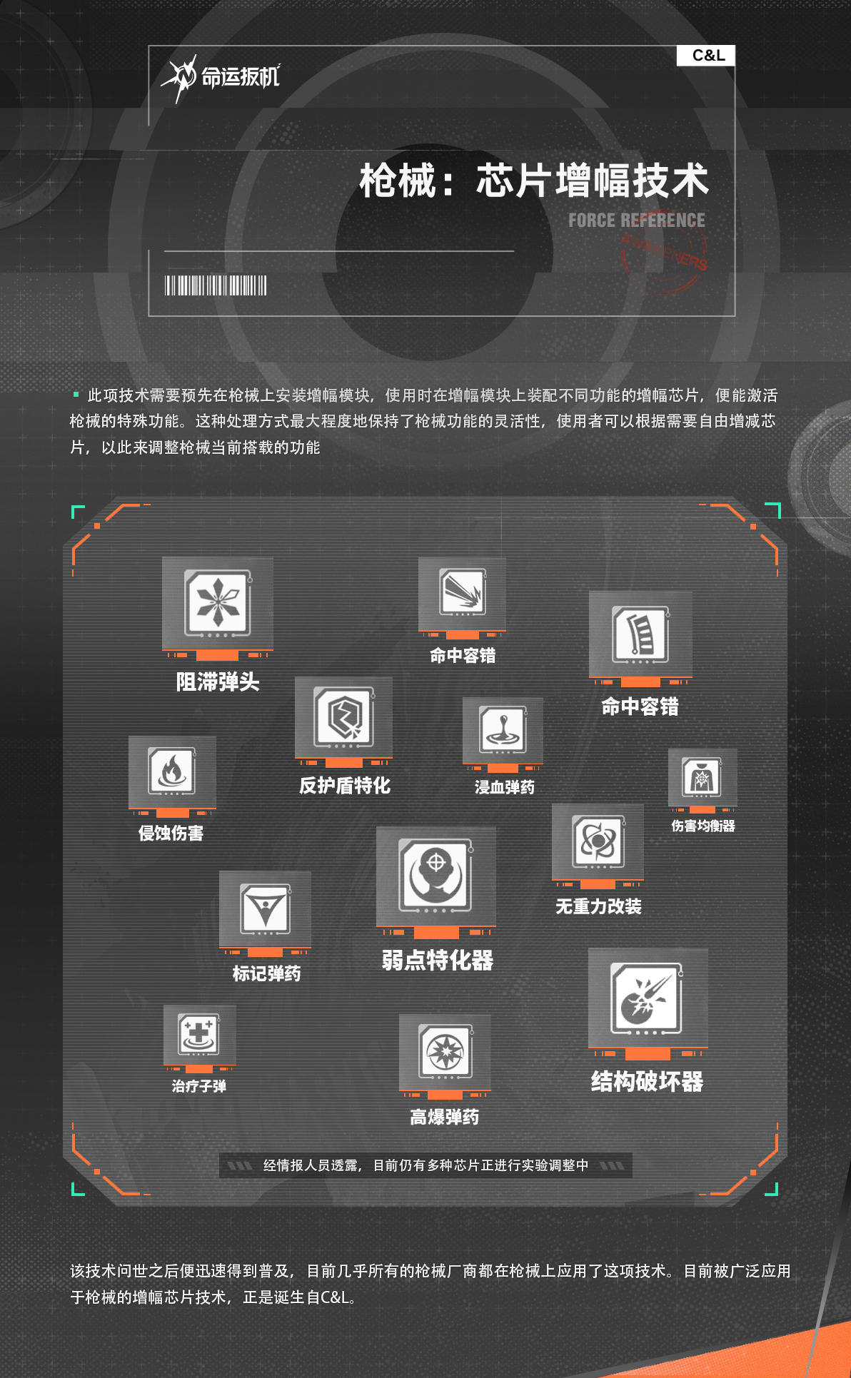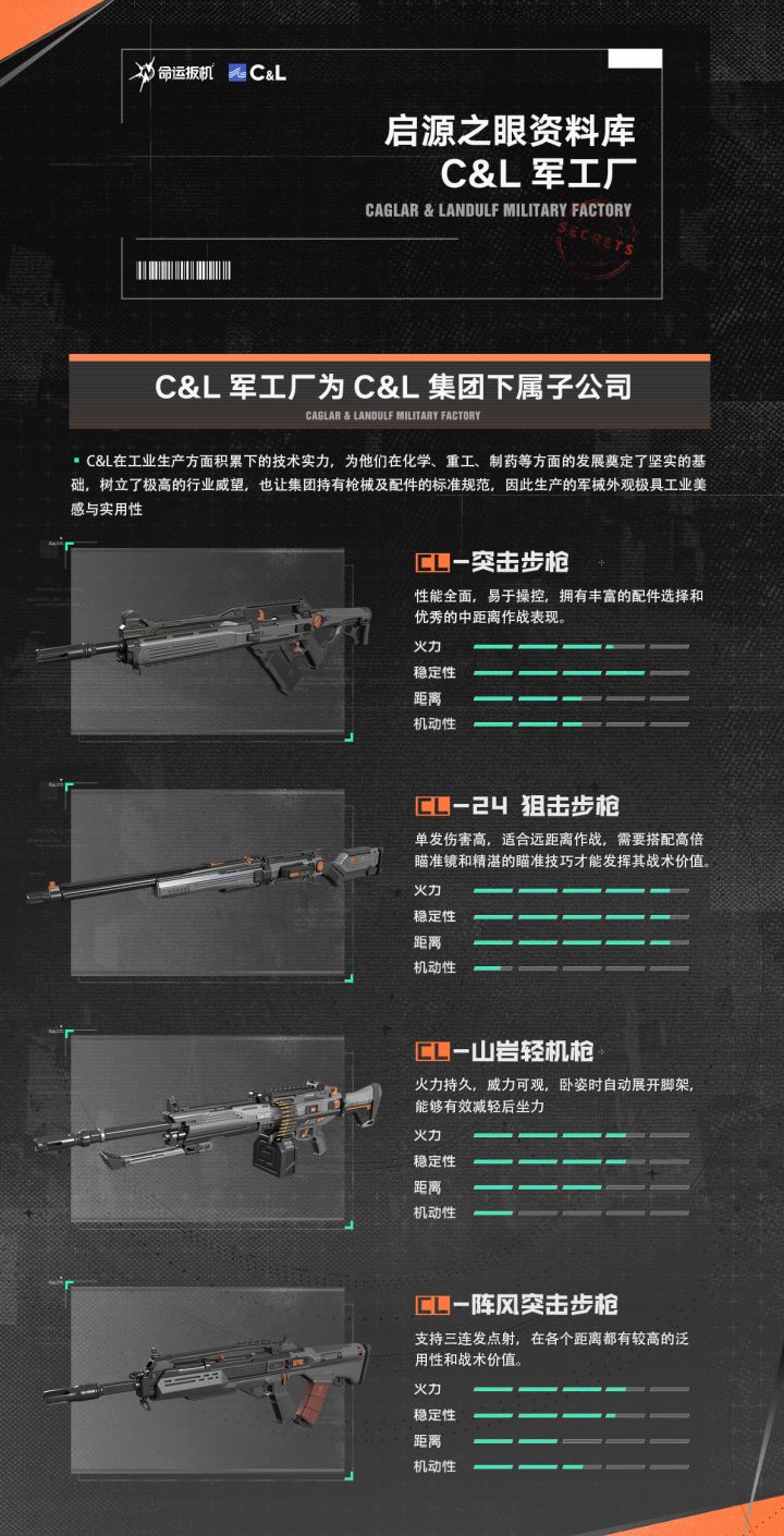 >>> 访问权限:已批准>>> 载入资料:C&L军工厂C&L军工厂拥有深厚的工业底蕴,其生产的军械极具工业美感与实用性。并且当前被广泛应用的枪械增幅芯片技术,正是由C&L研发。让使用者可以通过装载不同的增幅芯片,激活枪械的特殊功能。//以上资料均由情报人员提供并录入*当前内容为开发中版本,请以正式版本为准。#命运扳机