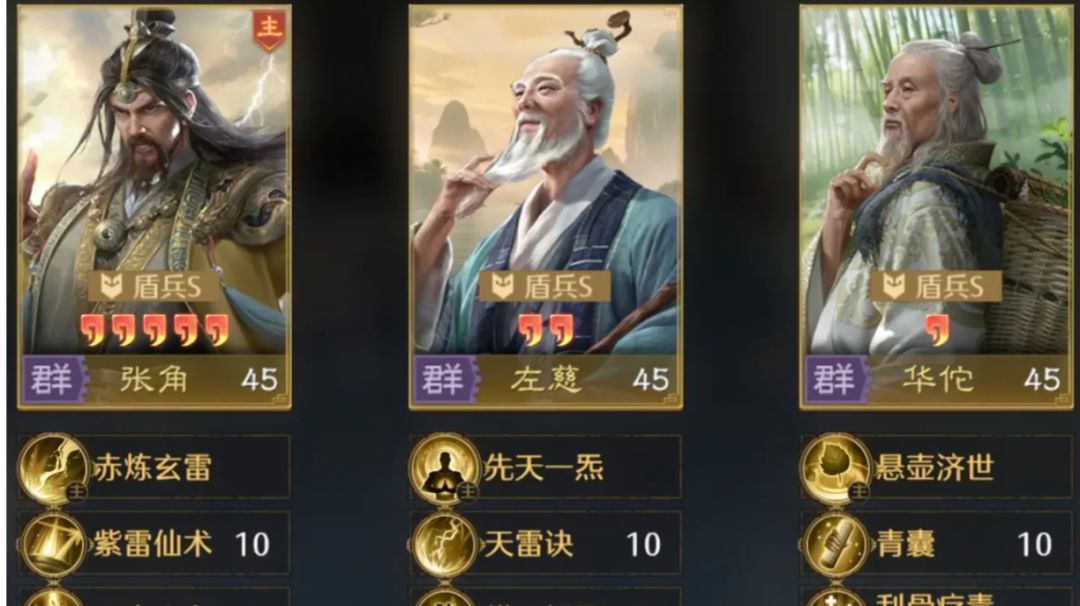 一、阵容搭配 标准三仙盾 变种中毒盾 搭配思路:主要由张角和左慈双核输出,左慈联动张角,其携带的技能能为张角提供狂风、雷雨效果以及增伤BUFF,从而触发携带技能的二段伤害,从而对敌军造成巨量伤害。而华佗就主要携带治疗和增伤技能,为队伍提供续航。标准三盾以主动技能爆发输出为主,而变种中毒队则以指挥技能持续输出为主。 技能替换: 华佗: 刮骨疗毒—仁治武功—资军后勤 虎贲军—陷阵营—天香—坚阵合一鬼谋