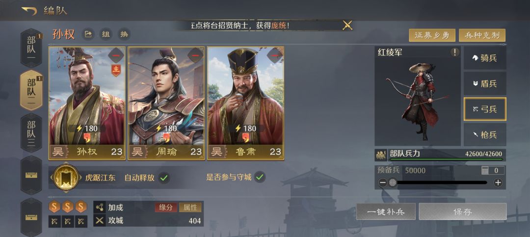 #九牧之野 #吴国恢复弓 阵容由主将孙权+ 周瑜+ 鲁肃组成 技能携带: 孙权携带一个加怒气的技能,以便战场上更快的释放技能,+一个造成伤害可以恢复我方兵力的,以便持续输出 周瑜携带一个灼烧技能+伤害技能,兼顾持续伤害的同时又有爆发伤害 鲁肃携带一个兵种技能+一个回复技能或者加成智力技能