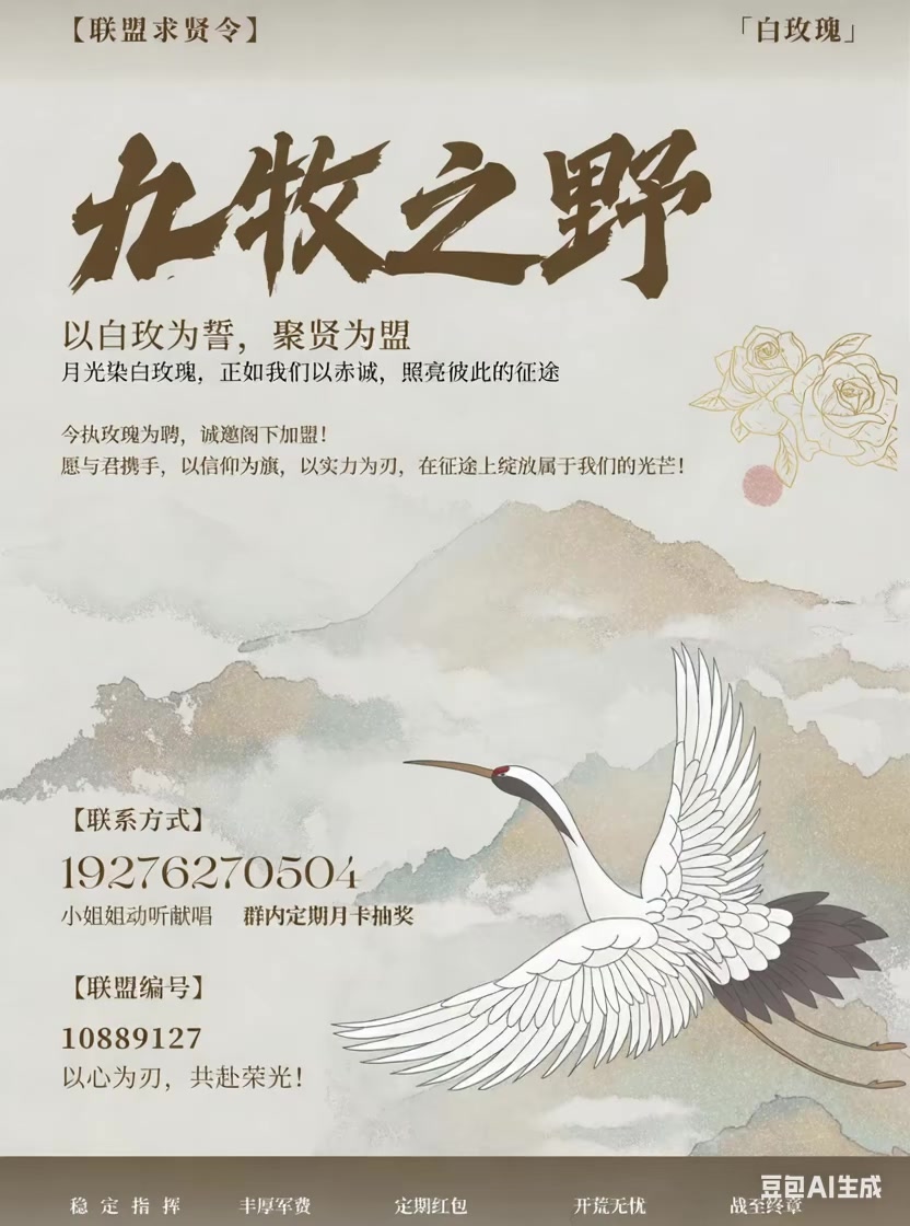 【九牧之野】内测盟公测备战! 稳定指挥+硬核兄弟,开荒无忧、资源拉满,诚招活跃战友,共冲榜! 速来抱团,战至终章! 编号:10889127 盟内有小姐姐唱歌,想来的➕v进盟 v:19276270504 #九牧之野