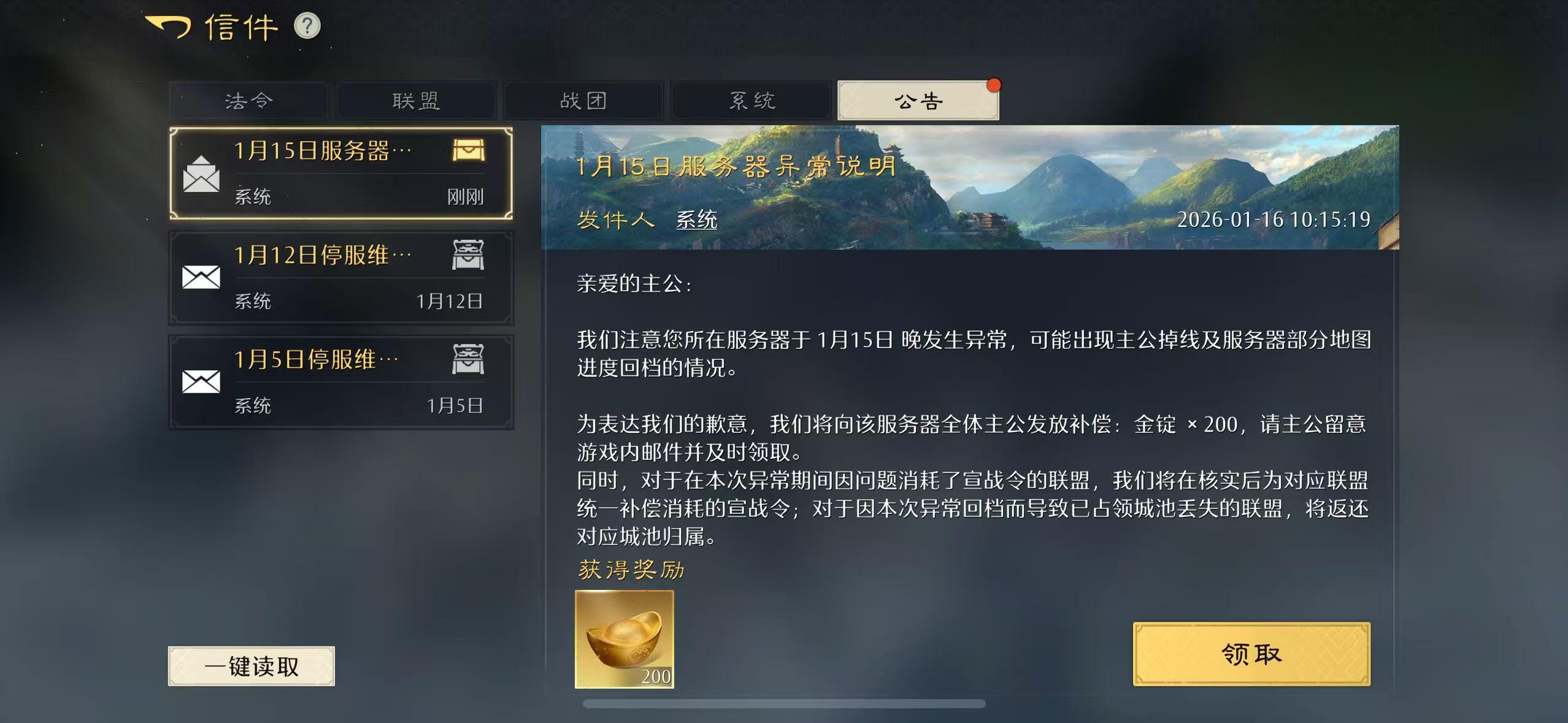 1月15日晚24区服务器崩溃导致回档,夜雨和仙武两个盟会同时宣战孟津,天策府严防死守,在仅剩7分钟的时候耐久还剩三分之一,眼看防守就要成功服务器突然崩溃,今天却要补偿对面宣战的令牌,那天策府一打二死守53分钟算什么?如果确认对面返还令牌,天策府全体将集体退游并投诉该游戏