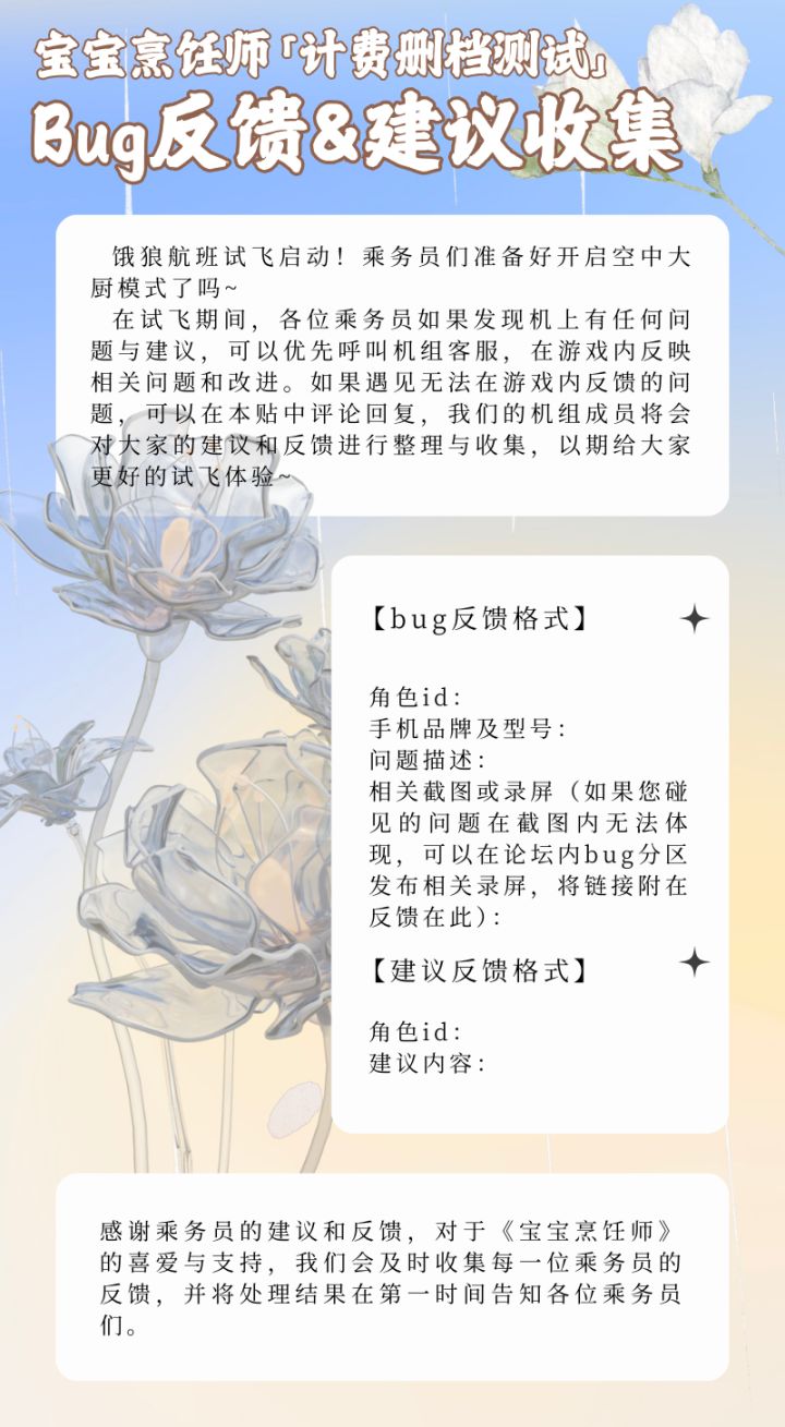 亲爱的乘务员: 《宝宝烹饪师》将于11月14日10点开启限量删档测试,期待与大家一同开启本次试飞之旅。 在测试开启之前,在《宝宝烹饪师》的社区和社群中,我们机组收到了许多乘务员的BUG反馈与建议,机组的相关人员已经进行登记,各位进行反馈的乘务员可以向机组客服发送反馈登记,领取反馈奖励哦~ 其中关于《宝宝烹饪师》美术人物原画问题收到许多的建议,我们已经纳入修改提案中,后续改进内容会在官方论坛、