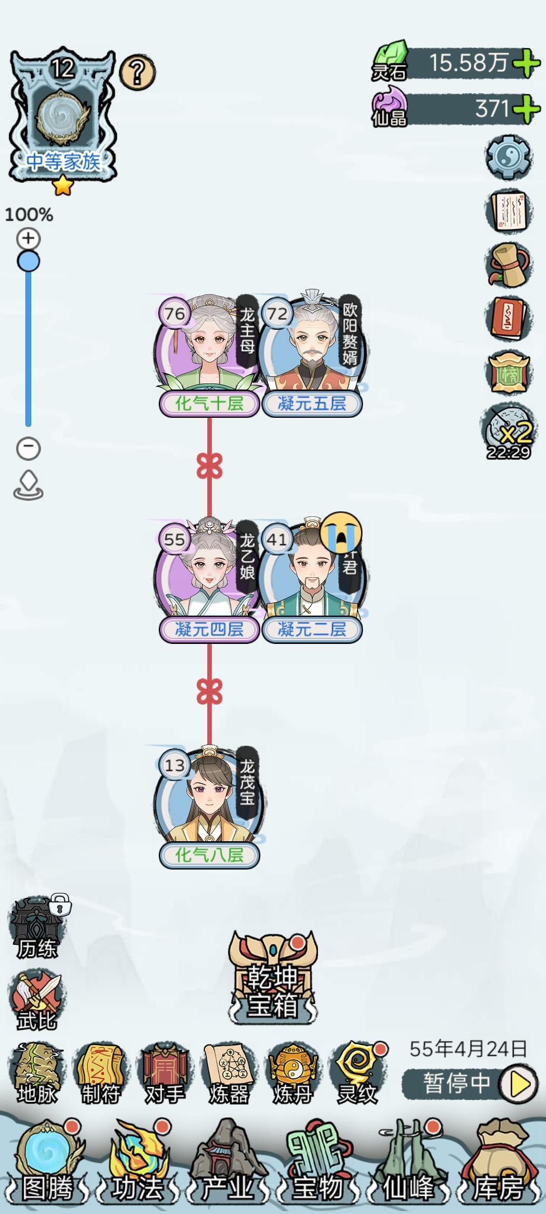 这个游戏我是刷了两次,第一次玩到那个天降灵宝那里,开始觉得这个号养废了,随机性太强,战队吃不到加成,全给没用的人加到了,没办法,重开吧,我是和男友一起玩的,我们玩了大概到三四代弟子那里我就跟他提要不要重开减员,反正老家伙一百多岁都没ji。他开始没同意,后来背着我偷偷重开,不到一下子超过我辛辛苦苦养了三天的号,那叫一个气!!!!!!