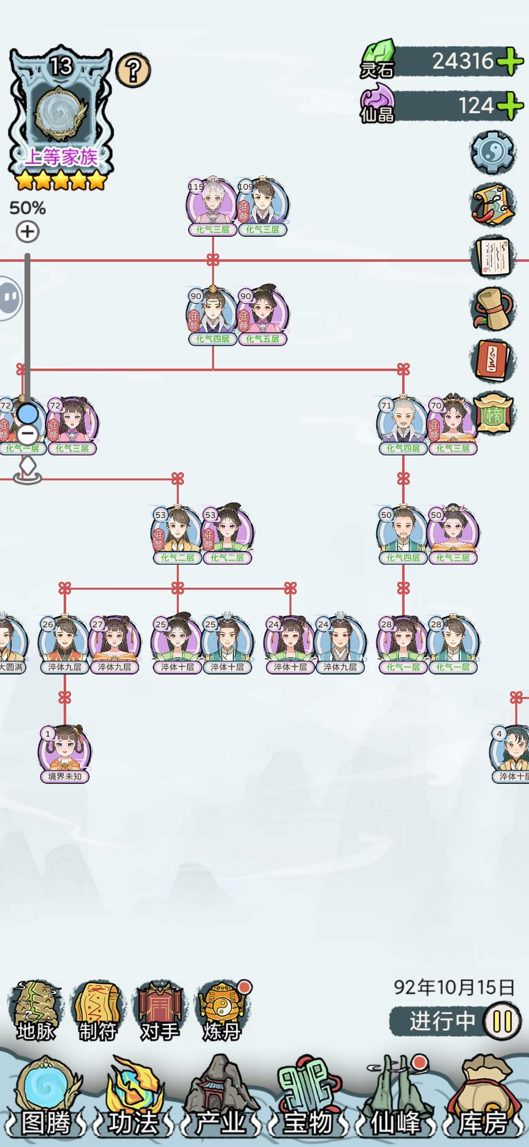 全12代通玄大圆满,在第13代也终于赢来了第一位绝对完美仙路的后代[图13](9级橙灵根,480%凝元,3×300%结丹,480%洞天),之前曾一度怀疑刷不出来。 宝物: 极·红神兵138,红神兵74 极·红宝甲78,红宝甲134 极·红灵兽89,红灵兽123 极·红神火73,红神火139 一代蓝印绿根经典开局,资质多点少点不影响(玩的久后面一代资质迟早溢出,最高有效资质10070),一代修为最好