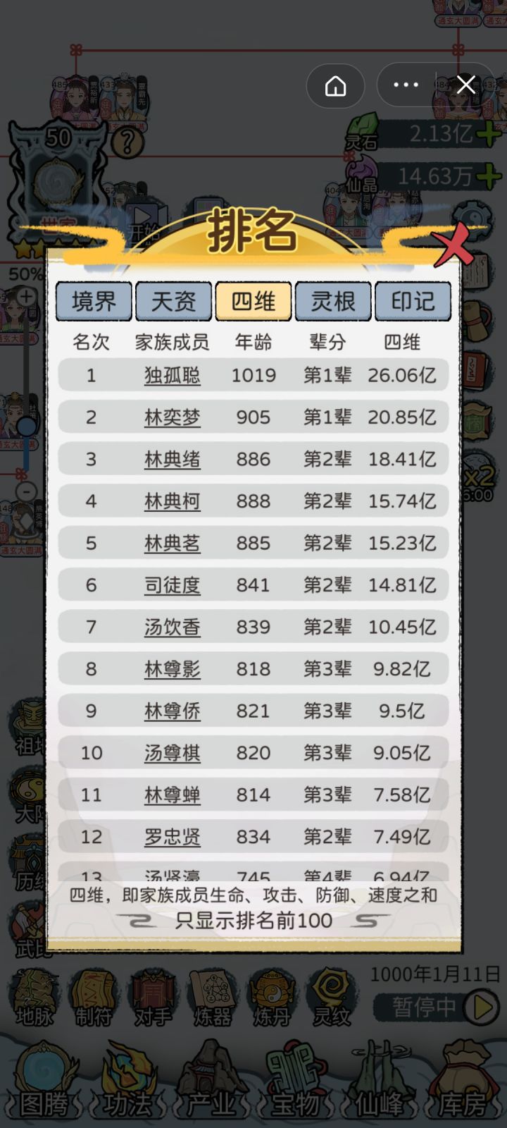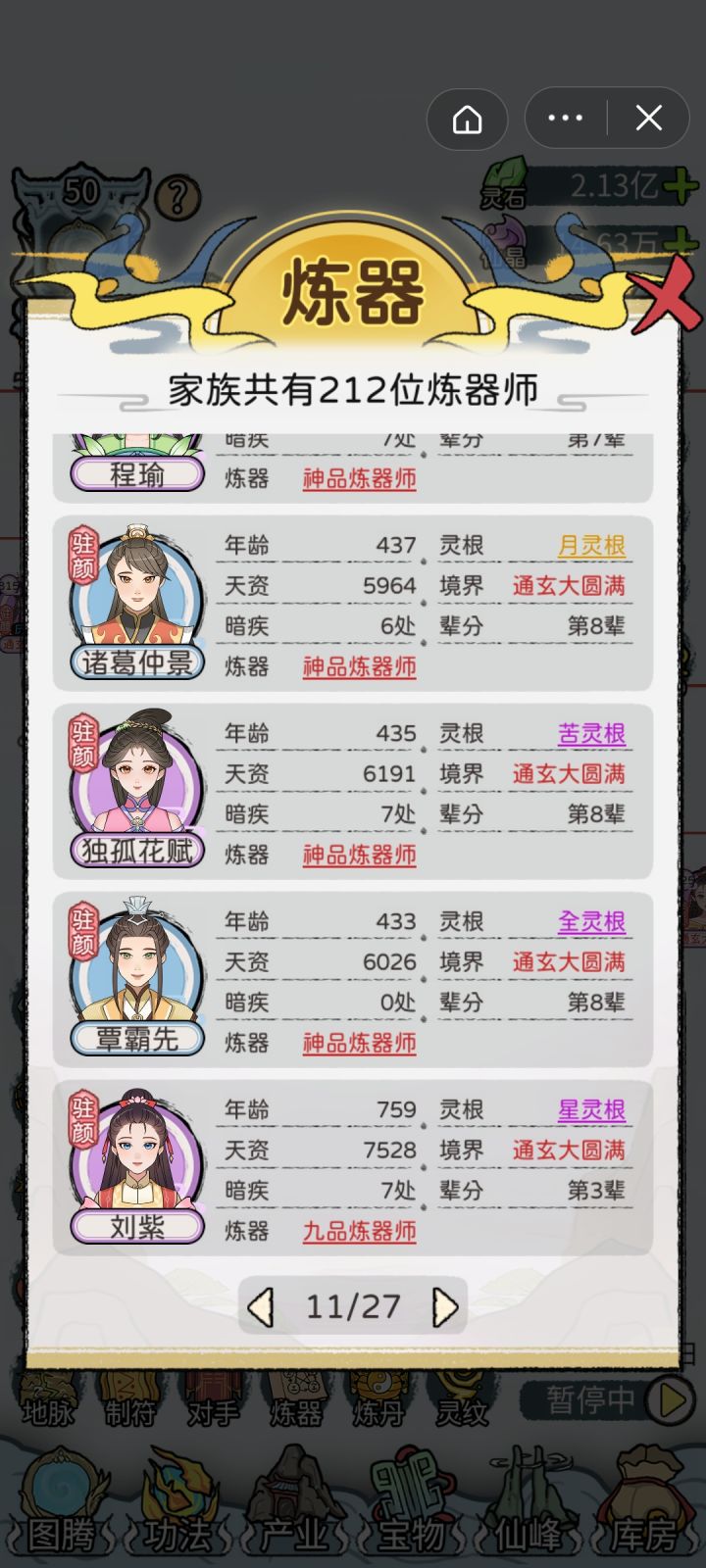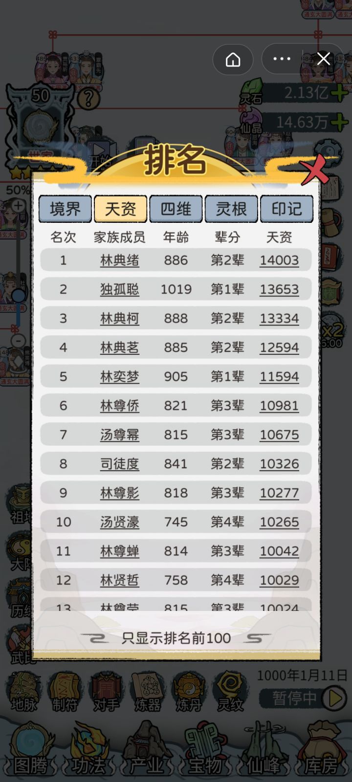全12代通玄大圆满,在第13代也终于赢来了第一位绝对完美仙路的后代[图13](9级橙灵根,480%凝元,3×300%结丹,480%洞天),之前曾一度怀疑刷不出来。宝物:极·红神兵138,红神兵74极·红宝甲78,红宝甲134极·红灵兽89,红灵兽123极·红神火73,红神火139一代蓝印绿根经典开局,资质多点少点不影响(玩的久后面一代资质迟早溢出,最高有效资质10070),一代修为最好