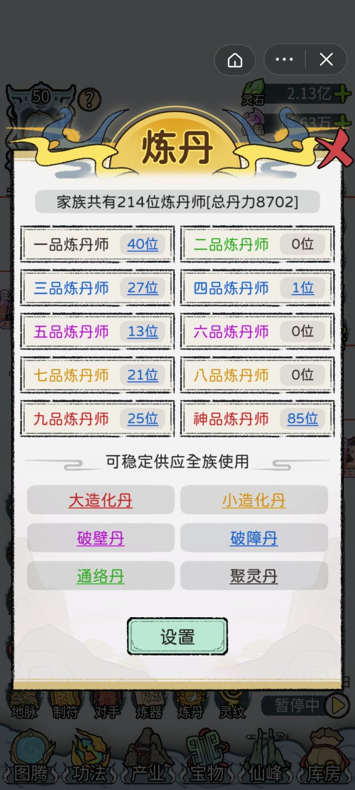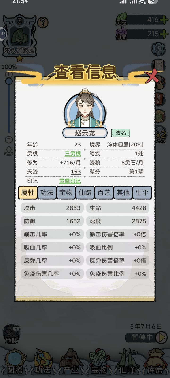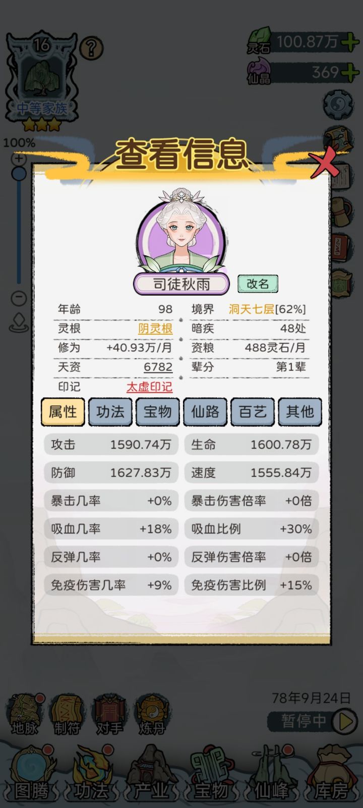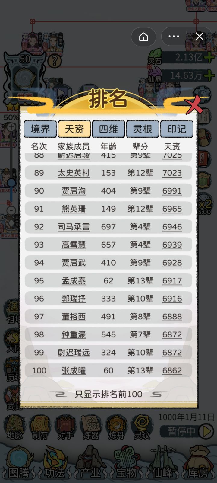 全12代通玄大圆满,在第13代也终于赢来了第一位绝对完美仙路的后代[图13](9级橙灵根,480%凝元,3×300%结丹,480%洞天),之前曾一度怀疑刷不出来。宝物:极·红神兵138,红神兵74极·红宝甲78,红宝甲134极·红灵兽89,红灵兽123极·红神火73,红神火139一代蓝印绿根经典开局,资质多点少点不影响(玩的久后面一代资质迟早溢出,最高有效资质10070),一代修为最好