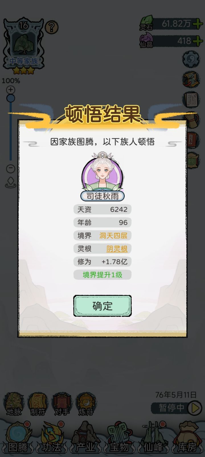 这游戏建议不结婚,没错不结婚,家族模拟器不带家人才是正解,依靠我们一代不结婚可以一直刷结婚事件的方式来实现稳定避婚(不需要记太多,就记几个明显避婚的选项就行,最好是记中间是避婚的,这个不怕点错),靠后代慢慢提天资升境界不如靠单人顿悟事件提境界,而且天资提的也快,除了前期难受(最好有商店快速提等级,不然一直跳结婚事件)家族等级慢一点,后面境界上来了属性加的很快数值都是无脑的,而且单人