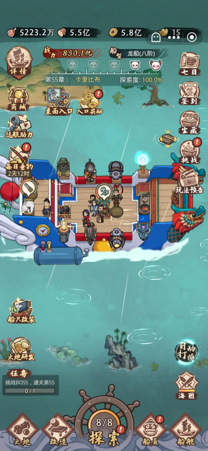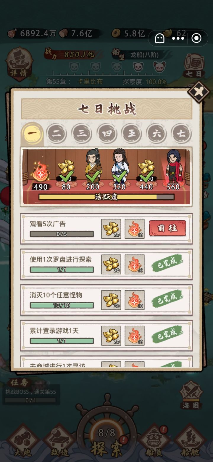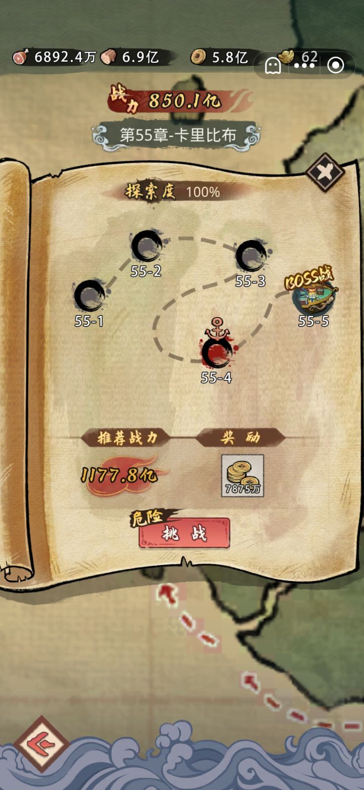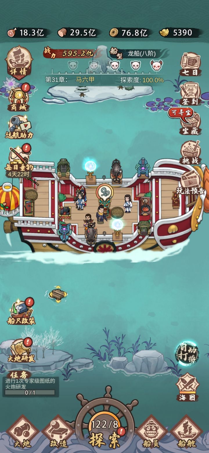 前前后后玩了一周吧。还差9关就打完了,后面没用新内容了,无非就是接着提升人物、船、武器,战力提上去就通关了。打到55关,一个小关提100亿,55-1才870亿,55-4就1170亿了。这个游戏不需要看广告,我一次广告也没看。有bug,可以快速刷资源,但是后面没啥新东西了,懒得刷了