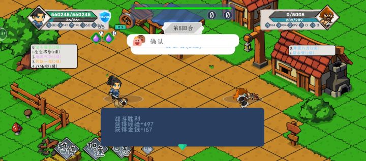 技能背包太小,这样3个技能合成一个有点太难了,技能刷新价格高了,导致更难升级。等级丹田扩展就更不用说了,打完都没扩展几格,建议更容易扩大点。内力太少,而且没有普攻。两个肉盾有回血互相打不死,建议增加后续长回合的伤害,到最后判定玩家输有点难受。后续可以添入装备系统