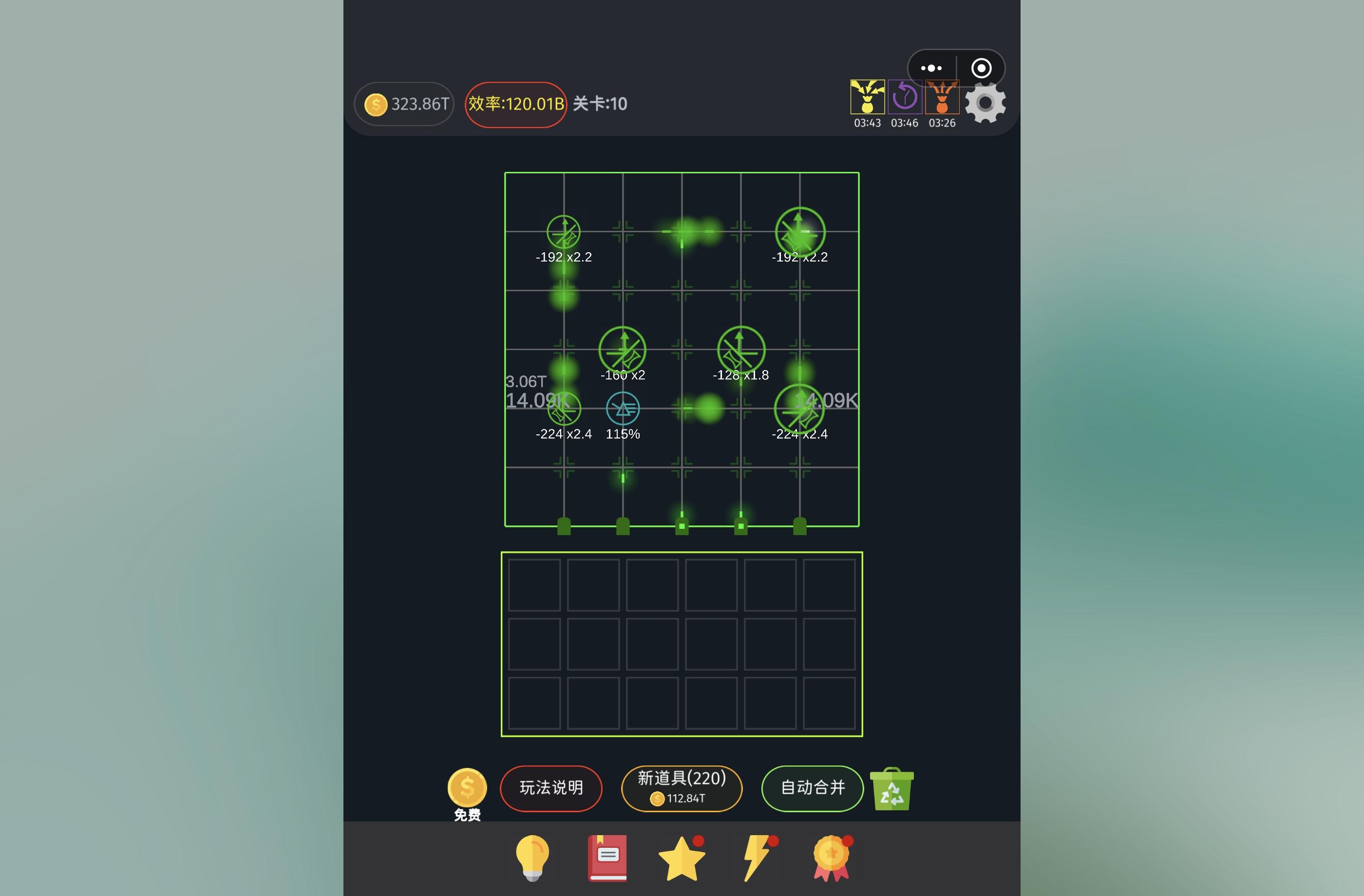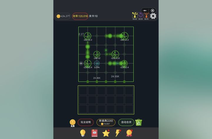 直接说结论,看起来每个道具都有上限,最菜的黄色不要合,等黄色数量够了就只会生成红绿蓝紫的,主力军是红绿蓝,构成回路具体可以参考下面这个(绿视情况调整为红)黄黄黄绿蓝黄黄绿绿蓝黄绿绿绿绿绿绿绿绿紫蓝蓝蓝紫紫