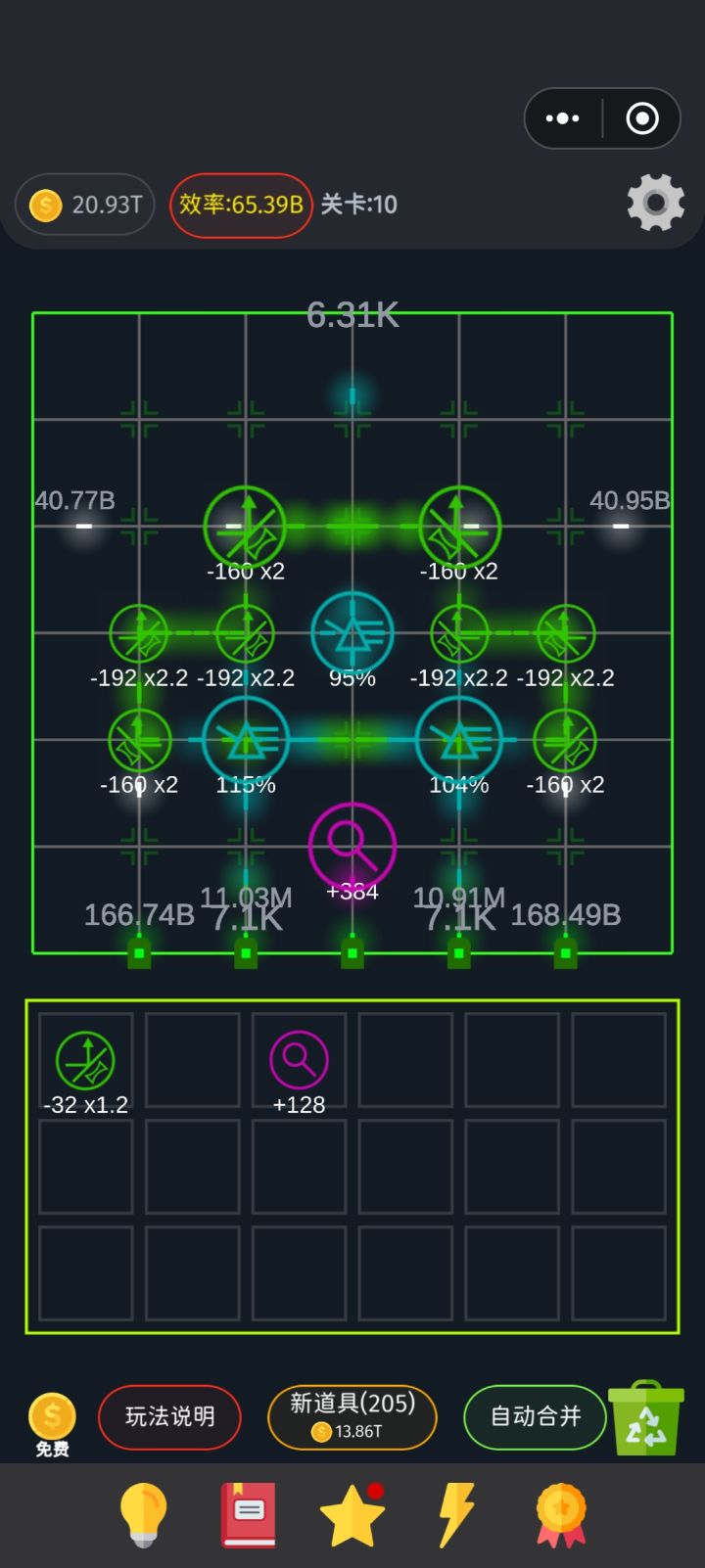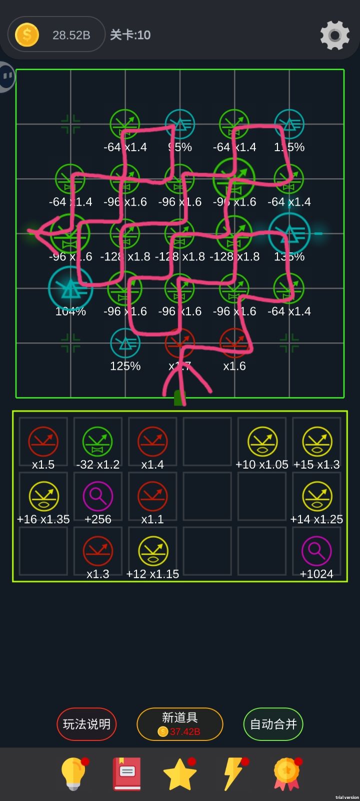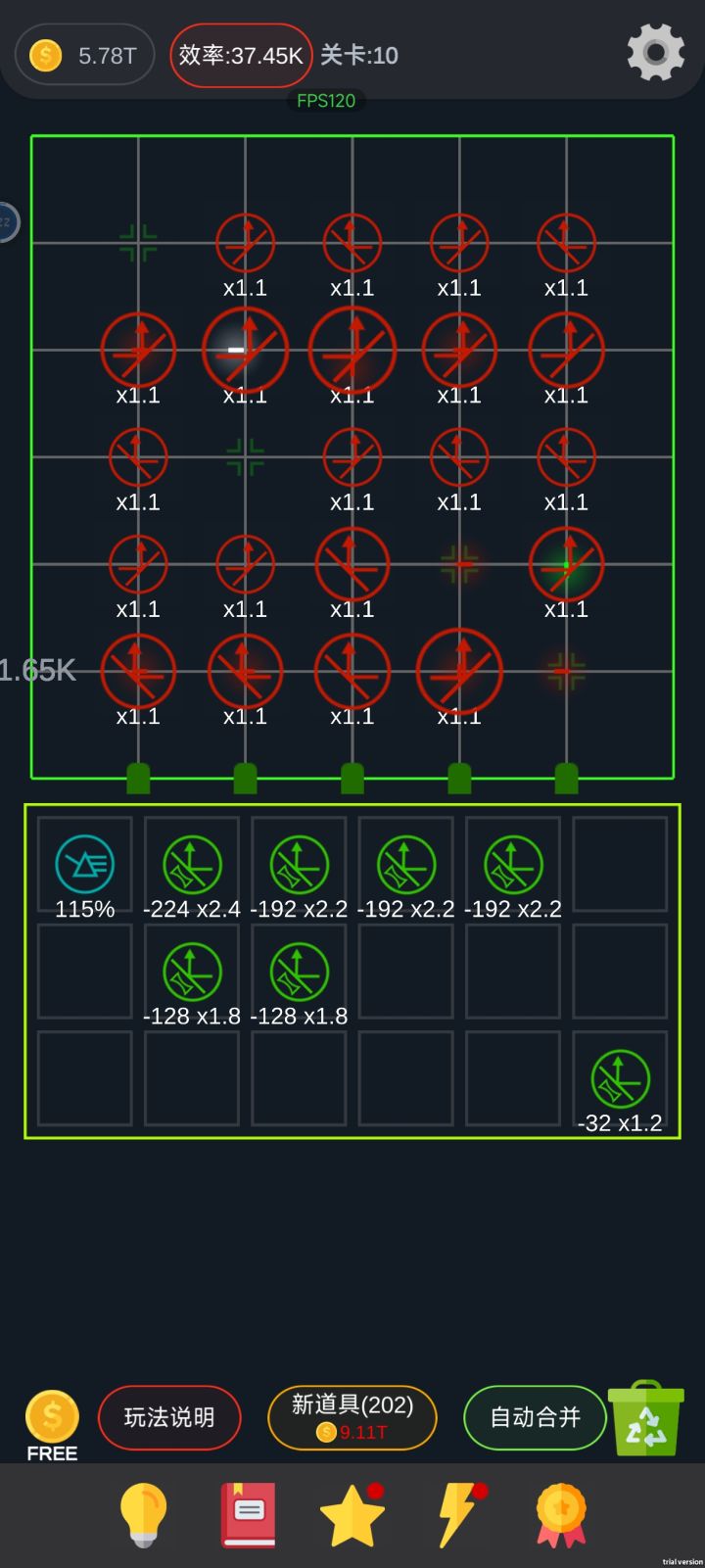沿着第一个光线经过的元件慢慢摆 摆到第十个可以升一下速度和金币等级 间隔不急着升