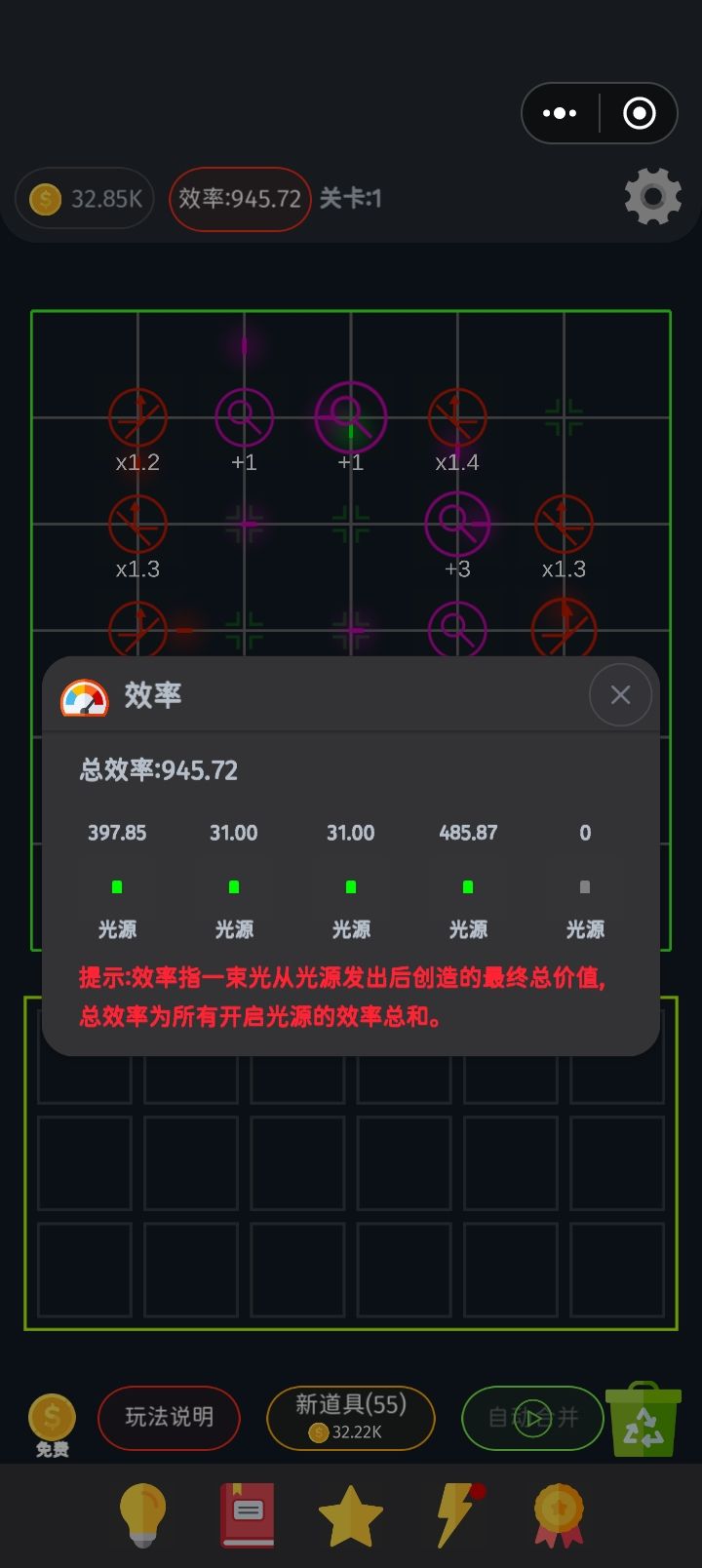 刚玩,还在第一关,说得不对敬请指正1、感觉光源升到2级就行了,多升级也没啥用,因为最多利用好两个光源;2、全部是1级反光镜、放大镜的情况下,感觉图二是倍率最高的,总共10个放大镜+10,还有10个反光镜倍率。但是光源数值总会升级,所以图二事实上还是鸡肋,建议用图一;3、图一由两个8字回环和外面的一个附件组成,总共18个原件,可以跑满25次。全是1.1反光镜的话,倍率是10.8倍。4、回环的
