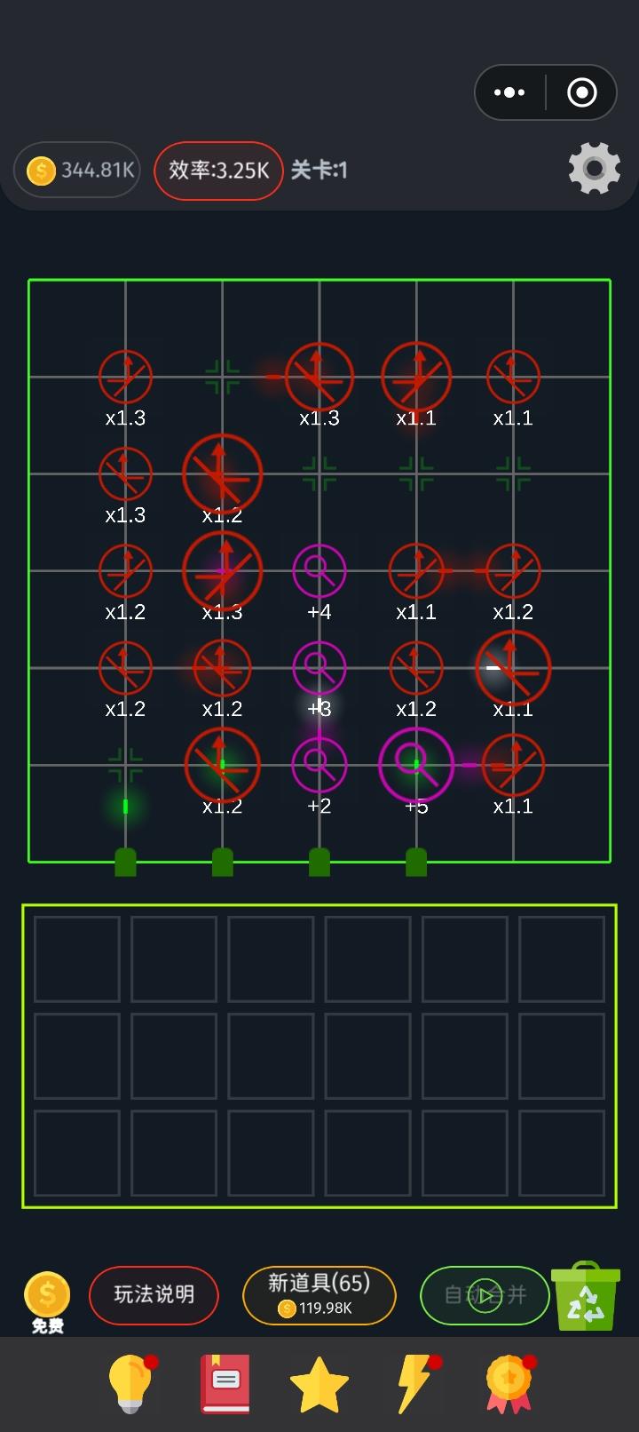刚玩,还在第一关,说得不对敬请指正1、感觉光源升到2级就行了,多升级也没啥用,因为最多利用好两个光源;2、全部是1级反光镜、放大镜的情况下,感觉图二是倍率最高的,总共10个放大镜+10,还有10个反光镜倍率。但是光源数值总会升级,所以图二事实上还是鸡肋,建议用图一;3、图一由两个8字回环和外面的一个附件组成,总共18个原件,可以跑满25次。全是1.1反光镜的话,倍率是10.8倍。4、回环的