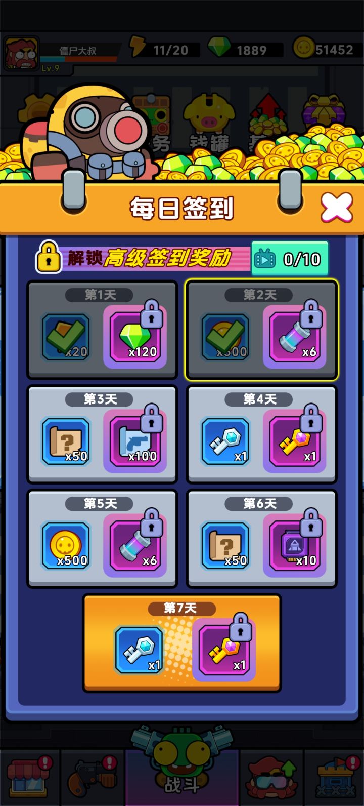 #差不多僵尸 #萌新攻略 首先每天只有50个广告必须花在刀刃上第一步也是最重要的武器伊夫利特花了20个广告解锁,可以用这把武器速推到39闭眼优先选主武器火箭弹,其它技能可以随便选(没有火箭弹只升一种技能就行)重要的事情说三遍,打完关卡有几率出橙色晶核,一定要留着三次看广告双倍,如果出了橙色晶核能变成两个还有30个广告就是小猪钱罐优先用,我第一天满了两次但是只能花10个广告还剩下20个广告