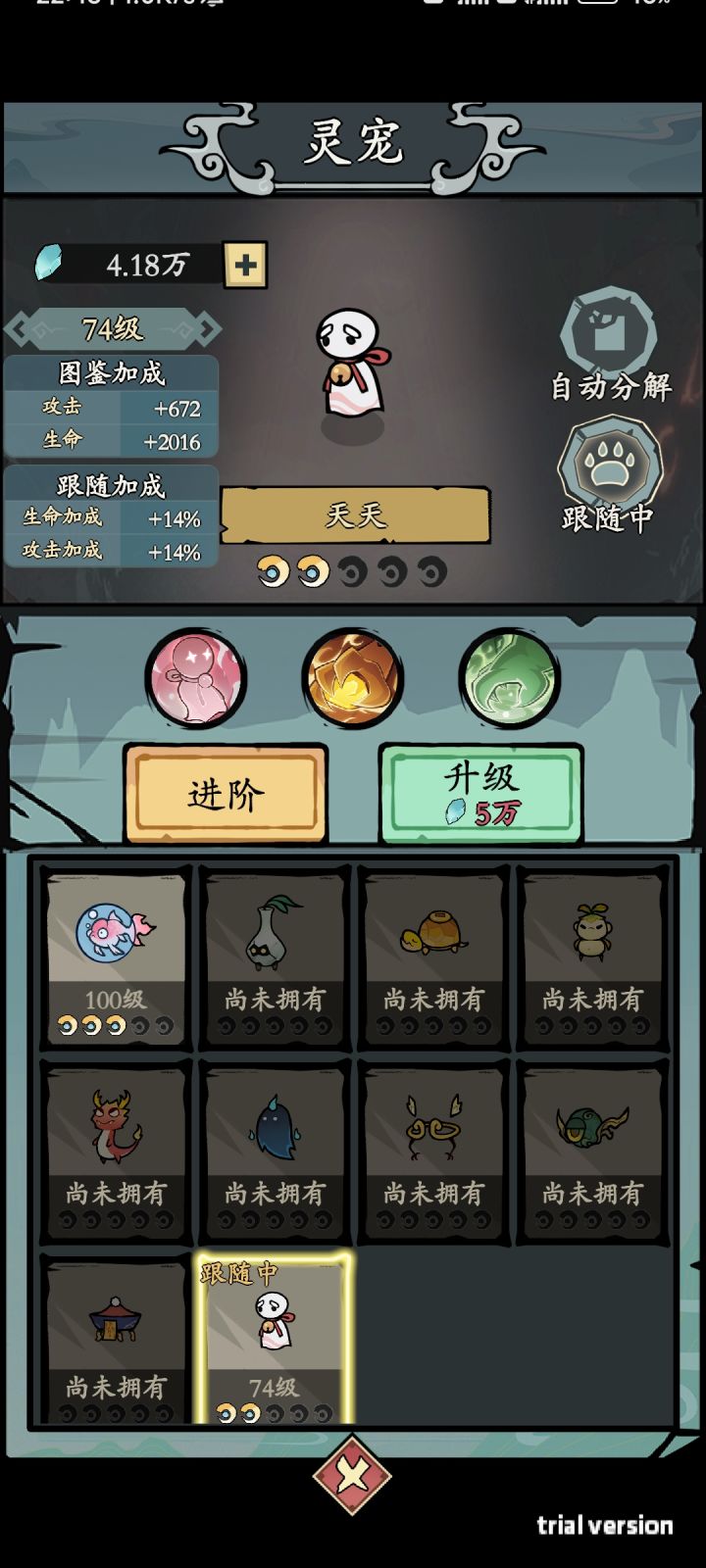 本次更新内容如下:本次更新调整:1.提高大乘期之前的装备爆率2.精英怪物技能叠毒buff的频率减慢3.优化技能释放索敌逻辑,主动技能会优先锁定怪物释放(视情况后续进一步优化)4.游戏节奏优化:筑基期之后的boss血量下调,金丹巅峰之后的击杀进度要求下调5.金箍灵宠叠层bug修复6.提升了部分法宝对技能的加成,希望让各种流派百花齐放7.多倍挑战倍率提升,次数提升8.其他一些偶发性B