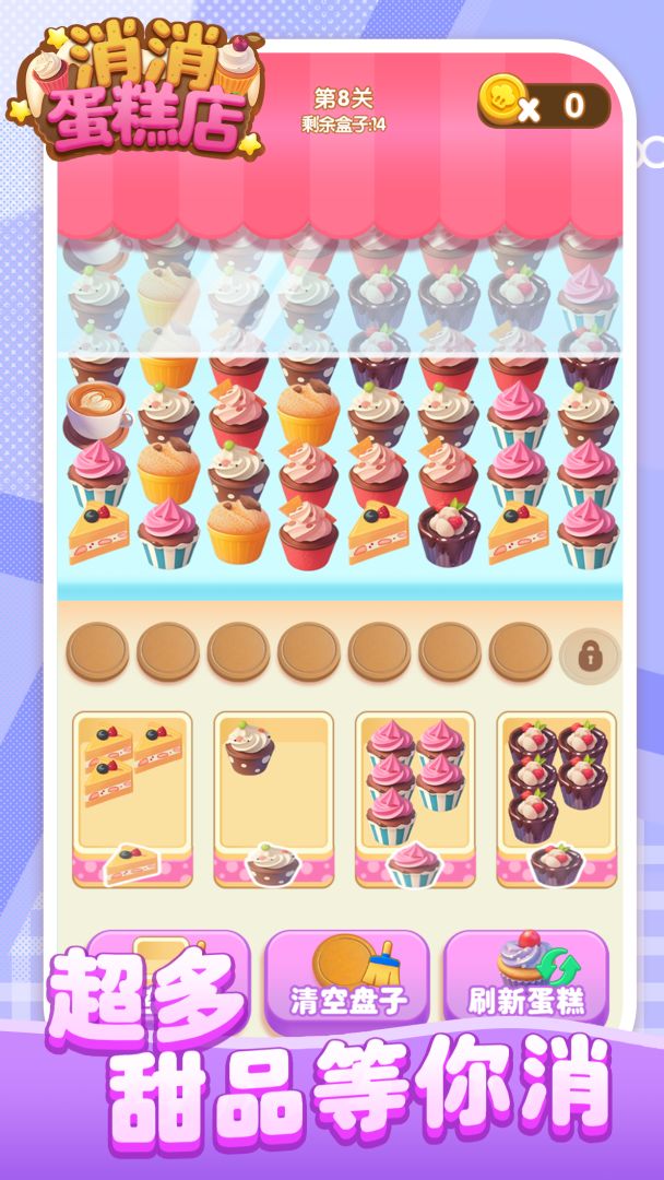 这是一款把蛋糕装满盒子的益智游戏,游戏方法为点击下层的蛋糕,按照盒子的需求把对应的蛋糕装满即可消除,满足顾客还可以获得金币,用来装扮自己的蛋糕店,快来挑战一下吧。