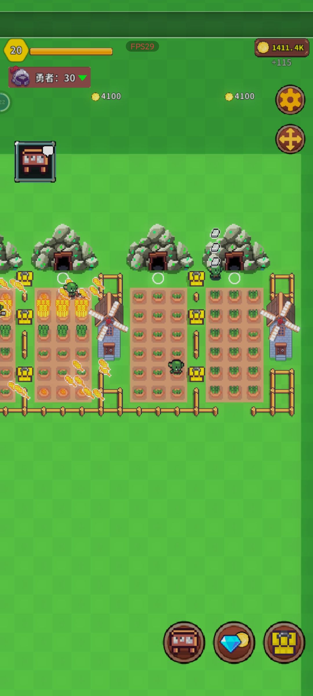 游戏核心玩法是经营冒险者城镇,冒险者会自动下本打怪。 你负责收购冒险者的素材,然后打造成装备卖给冒险者, 同时花费金钱雇佣冒险者部队,攻略高难度副本。 下面带来新手期布局和讲解,后续布局基于此往下扩建即可。 农田区:新手开始可以给每块农田配置1个哥布林,两个农田共用一个宝箱, 后期可以改成每个宝箱配置两个农田,每个农田配置2个哥布林。 注意,每块农田和其他农田,以及矿区不互通。 解析: 哥布林售价