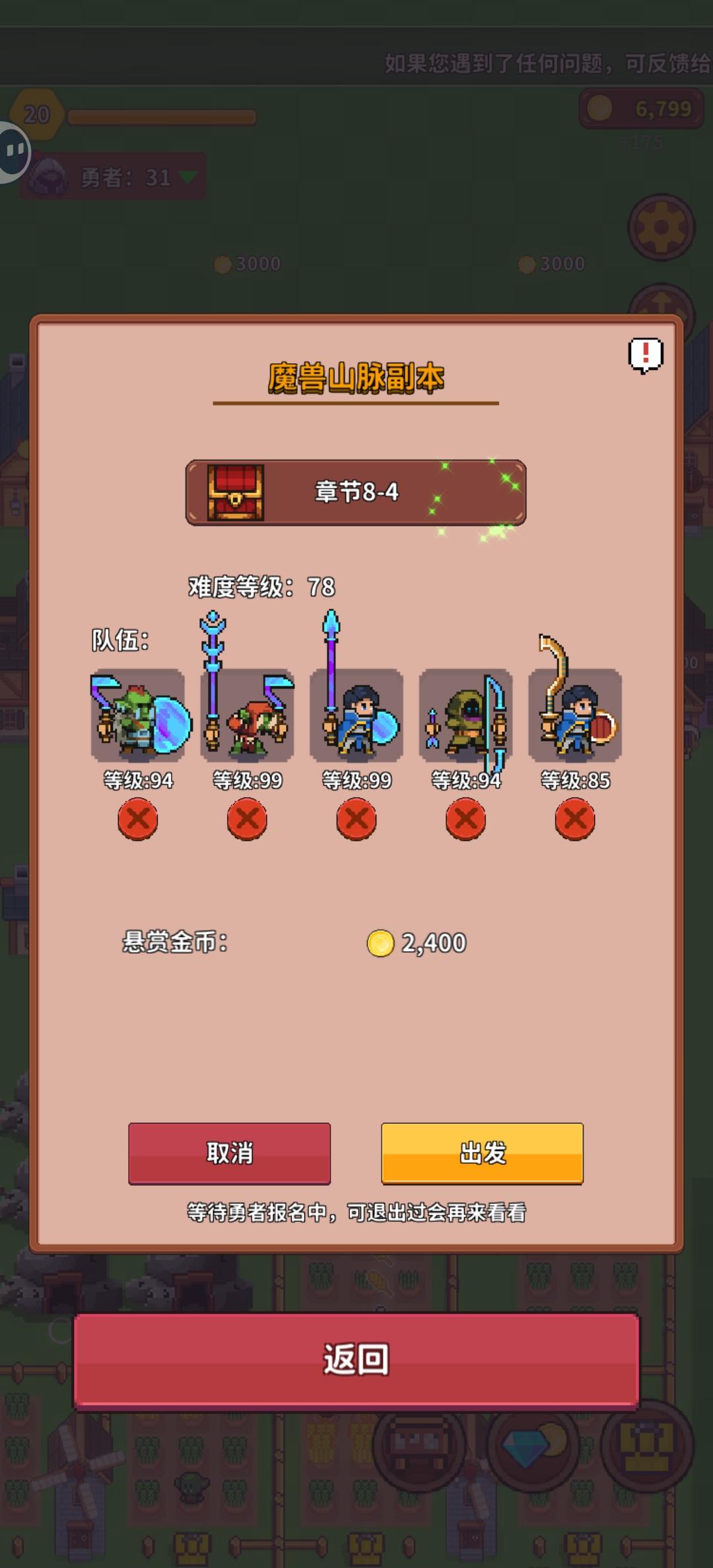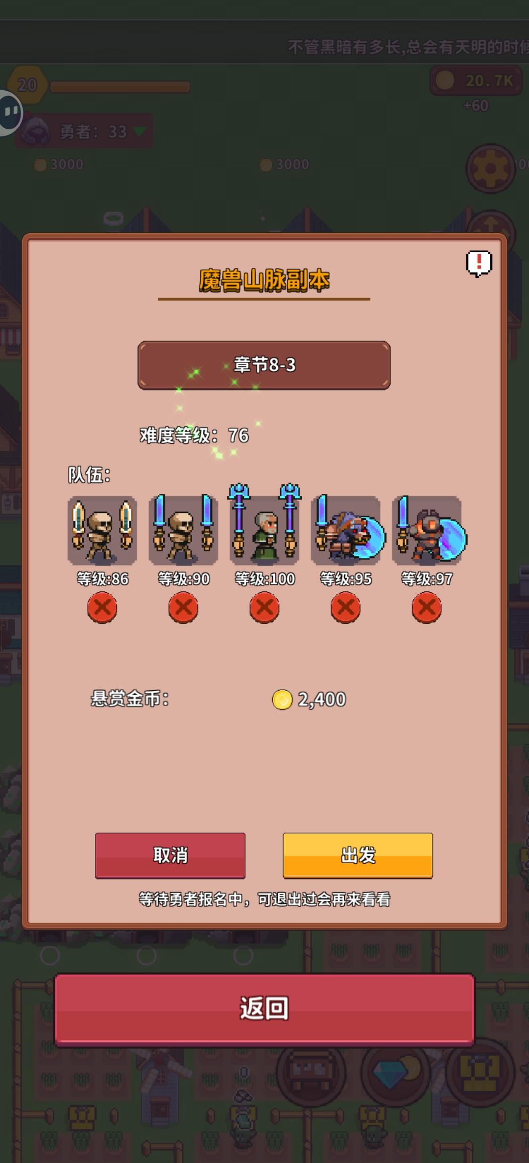 什么时候能设置一个“报名门槛”之类的东西呢?有时候看着人满了,进去一看是一些完全没达到难度等级的勇者,还得一个个踢了。有时候踢出去后会看见小人头上冒一个表示愤怒的小表情,挺可爱的,也有点难受。不是我想打击你啊,是你会死的。而且打8-3的时候好意外,图忘记截了,但是明明勇者86级了结果打76的副本阵亡了。打8-4反而85级勇者活下来了。是因为86是刺客而85是坦克吗?还有资助的问题,一个一个点