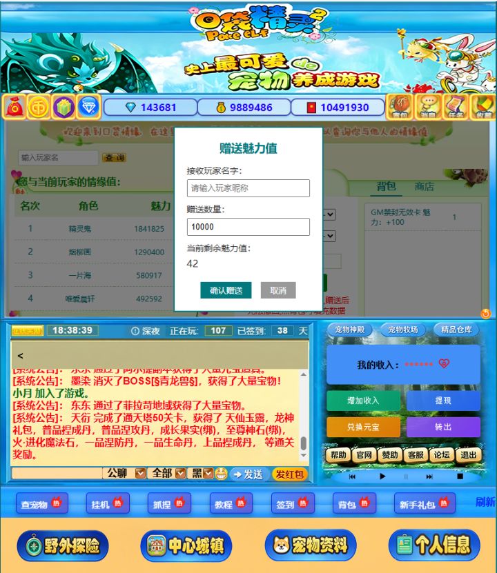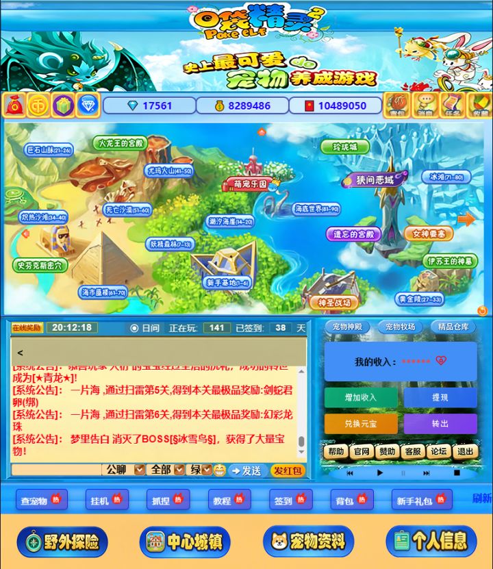 这是经典页游《口袋精灵2》的怀旧复刻界面,完美还原了当年的宠物养成玩法。你可以看到玩家“大西几”的角色信息,以及他精心培养的强力宠物“小神龙琅玡”,其成长值高达60.0,属性十分亮眼。界面中还展示了丰富的宠物图鉴、装备系统和社交功能,让你重温收集、进化宠物的快乐。无论是老玩家回归,还是新玩家入坑,都能在这里找到当年的感动与乐趣,开启一段全新的精灵冒险之旅。