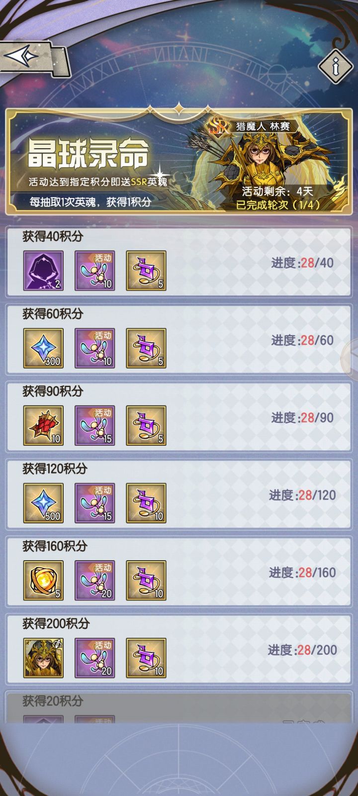每200次抽卡奖励是林赛,还有其他各种奖励很诱人,还能兑换一个自选SSR。钻石屯了1万4了,不知道该继续屯着(但害怕战斗力拖沓),还是抽法师职业池子(相当于25%概率的韦伯池子)?算了一下,1万4钻石只能抽90多次,哪怕再算上活动送的一些球球,应该也抽不满第二轮奖励。