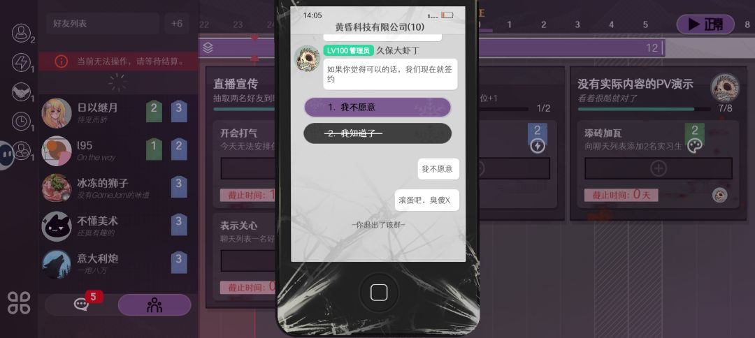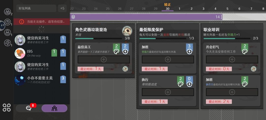 原创首发。 //游戏内图片部分违反taptap社区文明,无法放出。 基本规则: 1核心;每天会从好友里面随机抽取进入聊天栏至四个,前一天未用的聊天栏好友会占格子(也就是画大饼添乱的那几个0点得扔掉)。 2游戏结束要求:每天会增加一天时长和项目截止进度,当项目进度小于项目截止进度一定时间后或转正后游戏结束。 3关于周末:周末未完成boss的要求会加班,完成要求会跳过并抽取额外两名好友进入聊天栏。 4