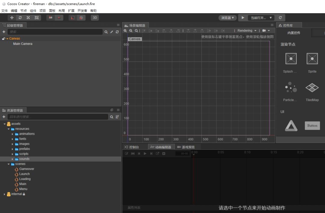 项目采用cocos creator 开发 建立游戏框架 场景分为: Launch 初始场景 用来加载初始化信息 Menu 游戏开始选择场景 用来显示游戏选项的信息 Loading 中间跳转加载资源场景 当下一个游戏的场景转入前的资源预加载,显示加载进度条 Main 游戏主要场景 分两个摄像机 一台摄像机用来拍游戏按钮等元素 第二台摄像机用来拍救火游戏界面 GameOver 游戏结束场景 游戏结束界