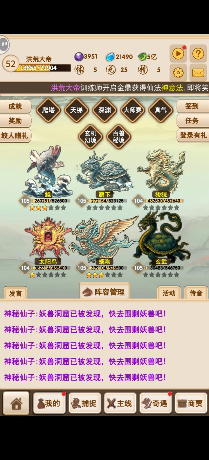 6,新手活动签到金宠,新手活动第一天的签到会有一只金宠,第3天会有一只,然后游戏等级十五级后奇遇里面有个神秘码,需要进群找群主私聊获取,然后这只新宠在第三天你会有两星,两星的金宠虽然无法媲美满星高培育度高根骨的蓝宠,但是星数越高意味着拉取进化度出来消耗资源更大,所以这时候的2星金宠完全可以使用了而且他的技能是3个目标,很香。