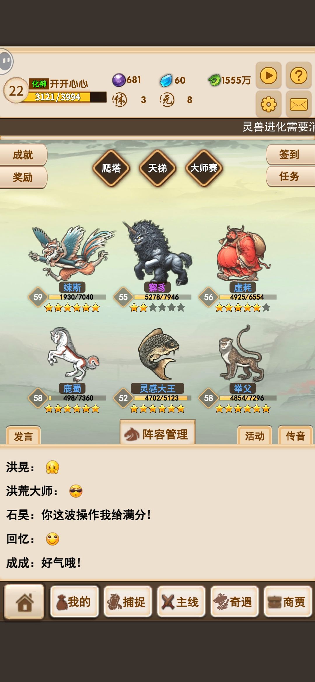 目前来说自身升级没有任何福利,不建议购买葡萄元气丹之类的,不如白嫖升级购买精元丹。 白嫖小氪攻略结合成就奖励最大化提升。 进游戏记得领礼包码 白嫖小氪开局的建议捕捉同样多的蓝色紫色为主(排除欧皇抽金色)进化越多加成越多,结合我们成就中进化达人给的根骨精华可以有效的提升四维属性。 通关的存紫色晶石存着去财神到拿你最高奖励上限。然后我们结合蓝色晶石去捕捉宠物。 体力的运用:卡关了我们可以去刷相应