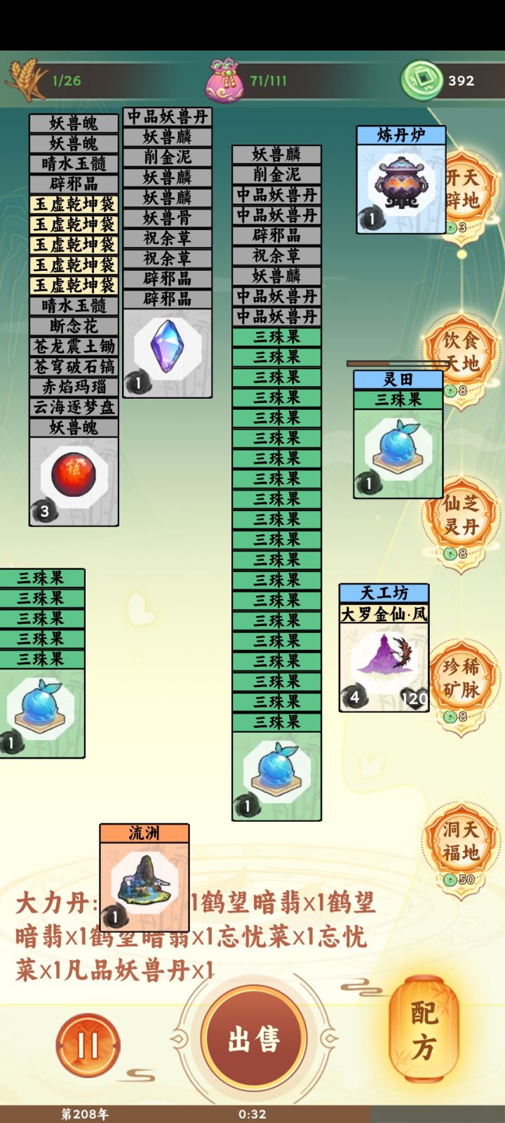 飞升丹药:1.练气期:人类+练气丹2.筑基期:练气期+筑基丹3.金丹期:筑基期+金丹丹4.元婴期:金丹期+元婴丹5.化神期:元婴期+化神丹6.炼虚期:化神期+炼虚丹7.合体期:炼虚期+合体丹8.大乘期:合体期+大乘丹9.渡劫期:大乘期+渡劫丹10.大罗金仙:渡劫期+金仙丹设施:1.灵田:五色土+建木枝+五彩石+人类2.庖厨:衔仙木+箬青叶+灵犀尘+人类3.天工坊:琉璃尊
