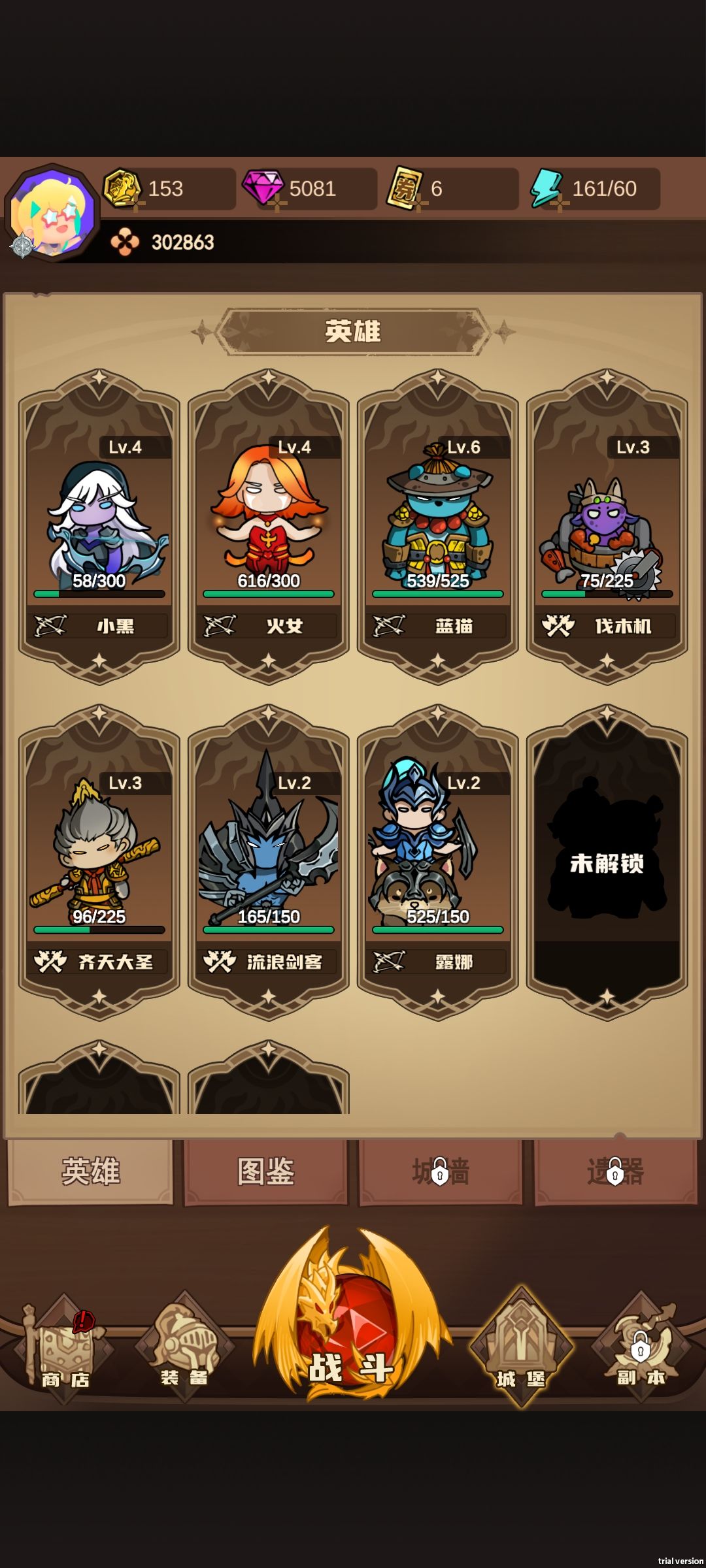 1,优先小黑6级,然后蓝猫,月女,大圣先拉到6级。再看自己喜欢选一个主力拉满。 2,空闲加QQ群领福利。 3,最好买个免广告,这游戏需要点的广告有点多 4,存5万去转轮盘拿技能宝石。 5,可以扫荡5次,过不了图就去扫荡