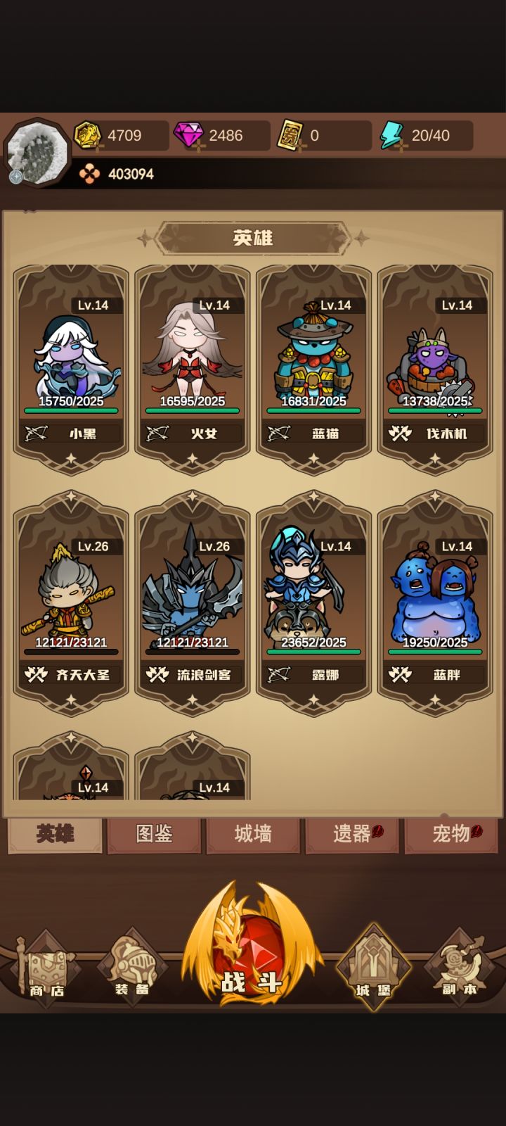 这个和另外一个氪金僵尸游戏。我也是参考群里的一些大佬建议。开头所有英雄先升2级出技能,然后金币把露娜和蓝猫拉到6级,其他金币升点装备,,石头随缘获取。目前28换,。充了两个广告的。后面听说怪物设置有很多各种免疫的。所以钻石一支不用,等卡关了再看看。不够体力可以买个周体力,700钻300体!#游戏安利#攻略#新手攻略