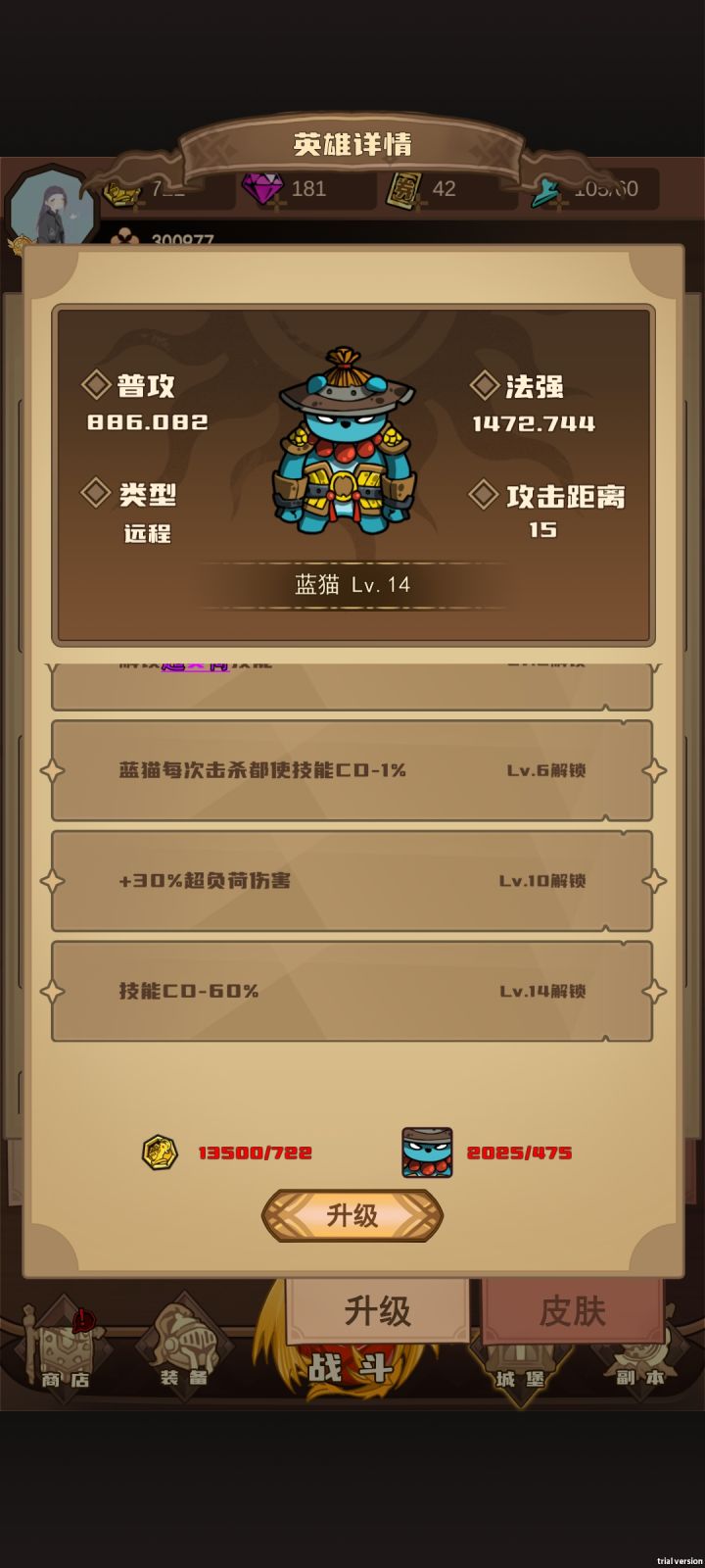 #游戏安利 氪金小月卡,为的就是免广告1资源分配四大核心资源碎片-升级英雄,没什么好多说钻石-活动任务获得,主要用来买遗物宝石-用任务给的钥匙开宝箱金币-游戏非常!非常!非常!缺金币,但是金币作用很大,能升级英雄(开新技能),能升级装备(加攻击)。这个游戏主要卡关点就是攻击,所以建议升级核心英雄,然后就升装备。核心英雄:1:蓝猫思路: 14级以后蓝猫自带60cd,拿人头后永久