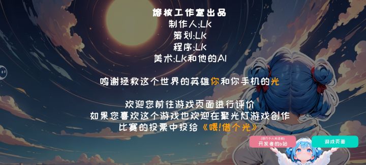 单人开发太难了 其他队伍游戏都有模有样了,我这边还在搭基础系统,眼看时间一天一天过去也不管画面什么的了 直接主角就是纸片人了 单人开发太难了x2 给大家说说近期的进展 一直有做meta游戏的想法,就是说游戏角色知道自己是游戏角色,打破第四面墙直接跟玩家交流 本次比赛主题是光, 结合光这个主题能擦出怎样的火花呢? 既然游戏角色和玩家之间的媒介是手机 ,从游戏角色的视角看玩家,是不是就像天上有个大屏幕
