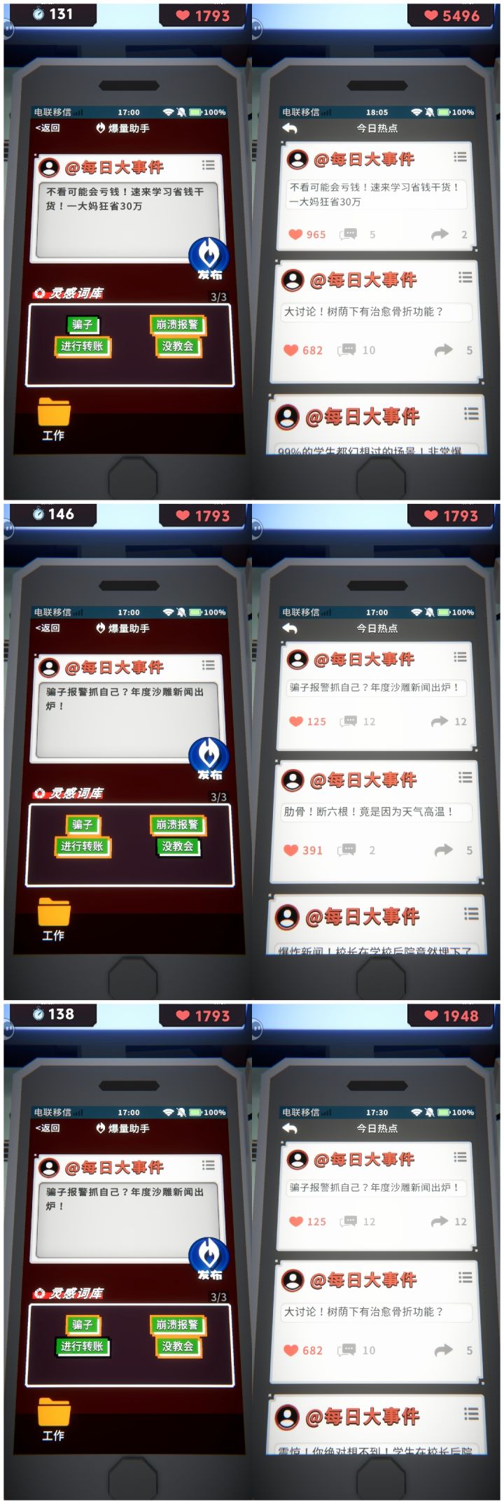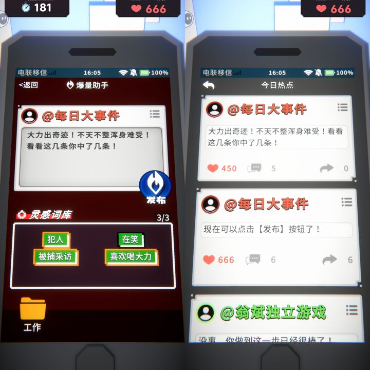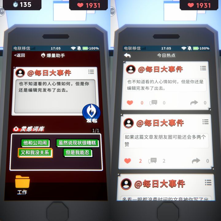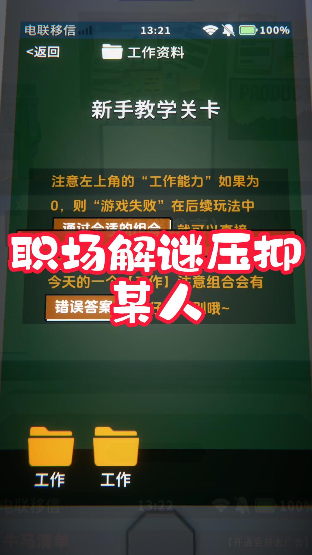【游戏故事】 玩家扮演一个在公司的底层员工。 面对繁重的公司任务,同事内卷的环境,以及飞涨的物价中艰难地生存。 直到有一天,你隔壁的同事没有出现在工位,而他的任务被分配到了你的头上。 面对成堆的工作你还没来得及梳理,就接到了一个陌生的电话。 电话那头是同事的声音 —— “救我。” 【进度汇报】 目前确定了游戏核心玩法和基础的叙事方式。 制作好了第一版本的UI内容,大家可以期待一下后续的玩法相关的演