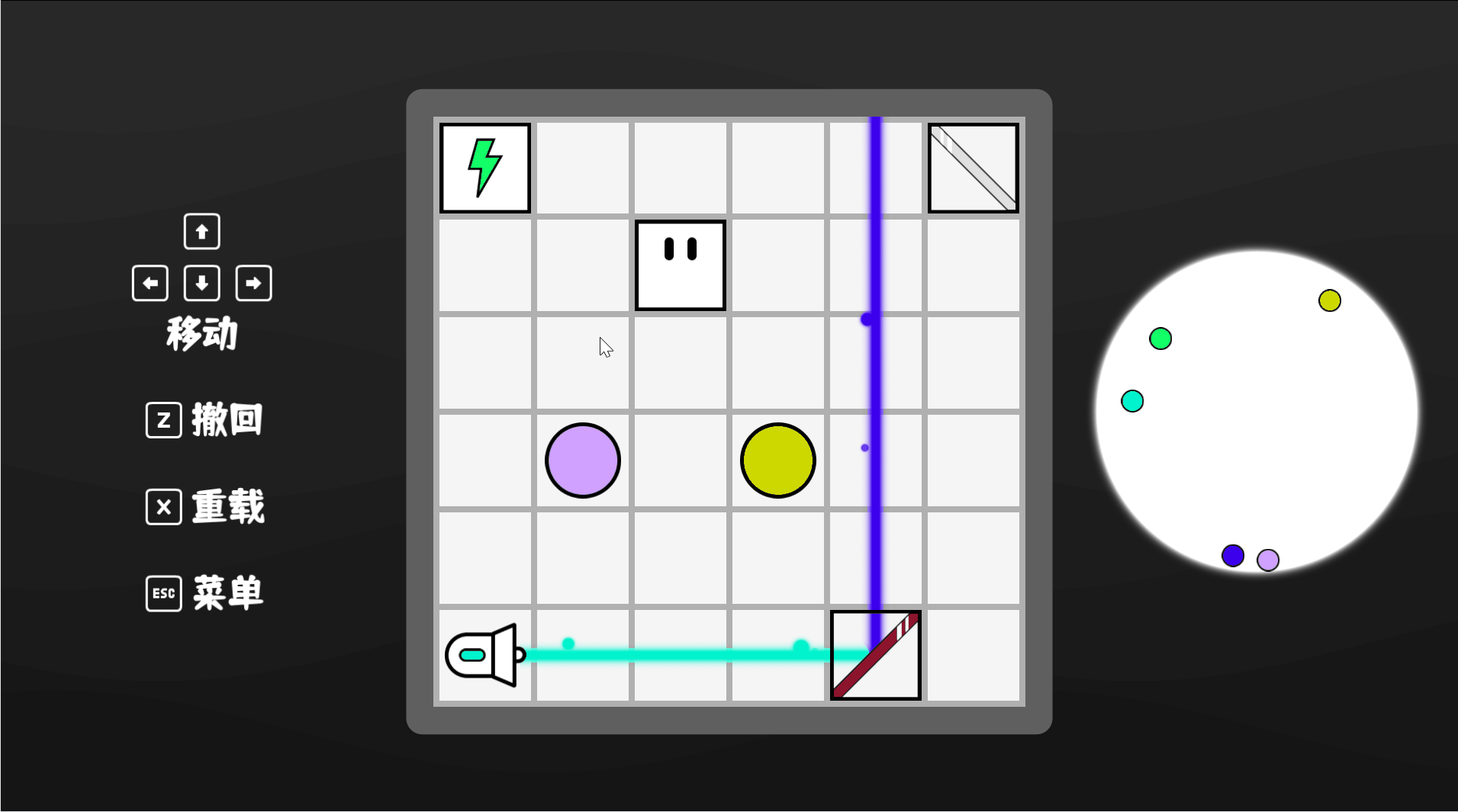 大家好,这里是诺新工作室。这次日志主要介绍新增的两个功能——撤回与颜色提示 有了撤回功能,玩家就可以在操作失误或步骤错误时快速撤回之前的操作,让关卡回到上个操作之前的状态,这给了玩家大胆试错的空间,不过撤回也有次数上限,暂时设为了50次。 所谓颜色提示,就是关卡面板下方的等式,它提示你当前关卡内某个物体的颜色与镭射激光的末端颜色混合后的结果。按快捷键可以切换颜色。“颜色混合”这一机制并不直观,因此