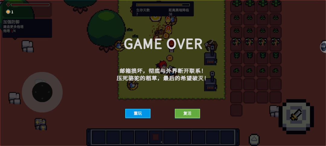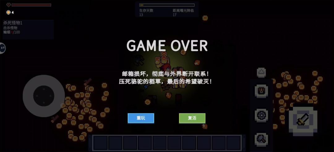 起因是这样的,不知道从第几天开始上方就没有怪物出现了,我当时没有意识到是什么情况,一直到某天我收集材料转悠到上边的时候看到出怪口往下两三格的位置正好有两个矿石并排卡着一只小怪,我寻思把石头挖了让炮塔给怪打掉,我就挖了,结果事情开始不对劲了,我跟着一起走,但是那只怪一直没死,一直到炮塔那了都集火了那只怪还是没死,再一看不是没死,我金币一直在增加啊,卧槽!突然想起来不知道啥时候上方不出怪的事情,tm的
